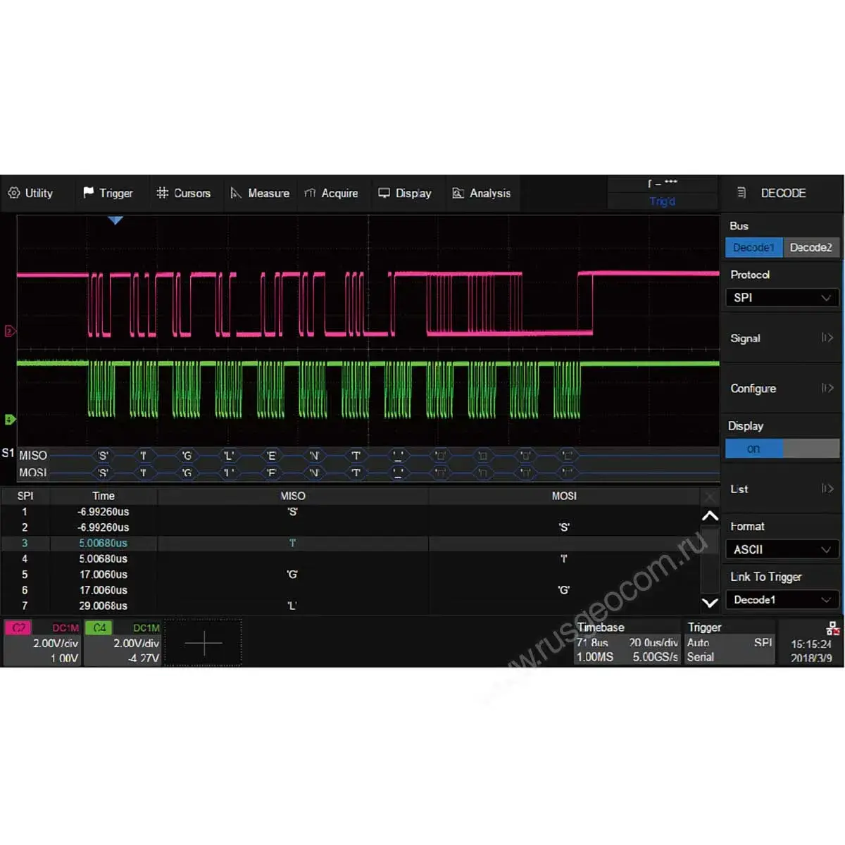 Оборудование поддерживает синхронизацию и декодирование большинства распространенных типов сигналов, что делает его универсальным инструментом для работы с различными протоколами и стандартами. Это позволяет специалистам легко адаптировать осциллограф под конкретные задачи и требования.