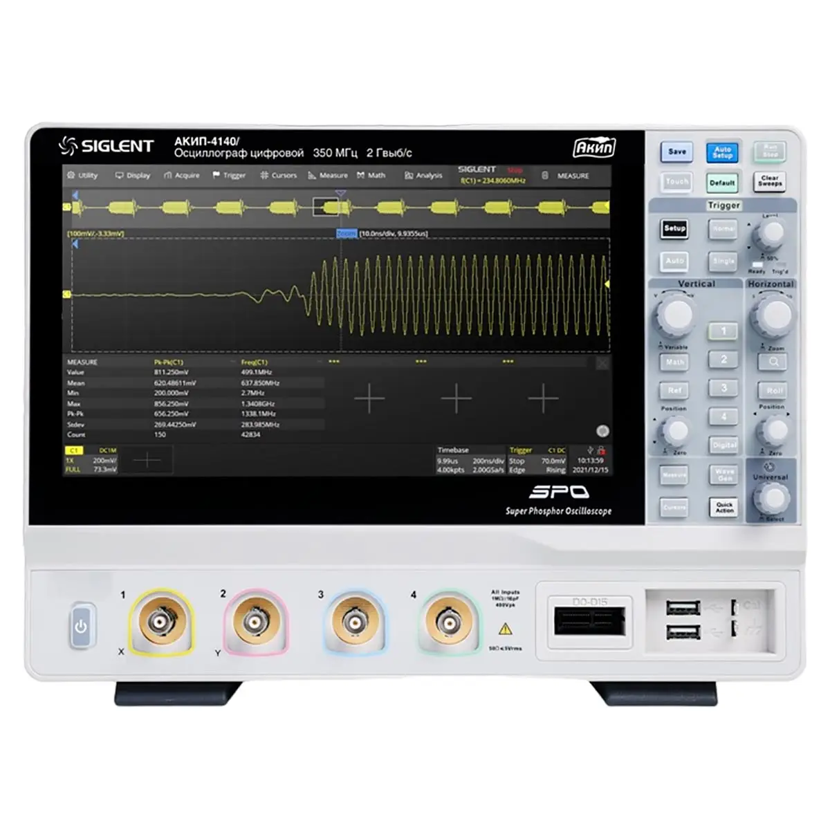±(δF·Tизм+2/Fд), где δF – относительная погрешность частоты внутреннего опорного генератора; Tизм – измеренный временной интервал, с; Fд – частота дискретизации, Гц режимы работы основной, ZOOM окна, самописец (ROLL), X-Y