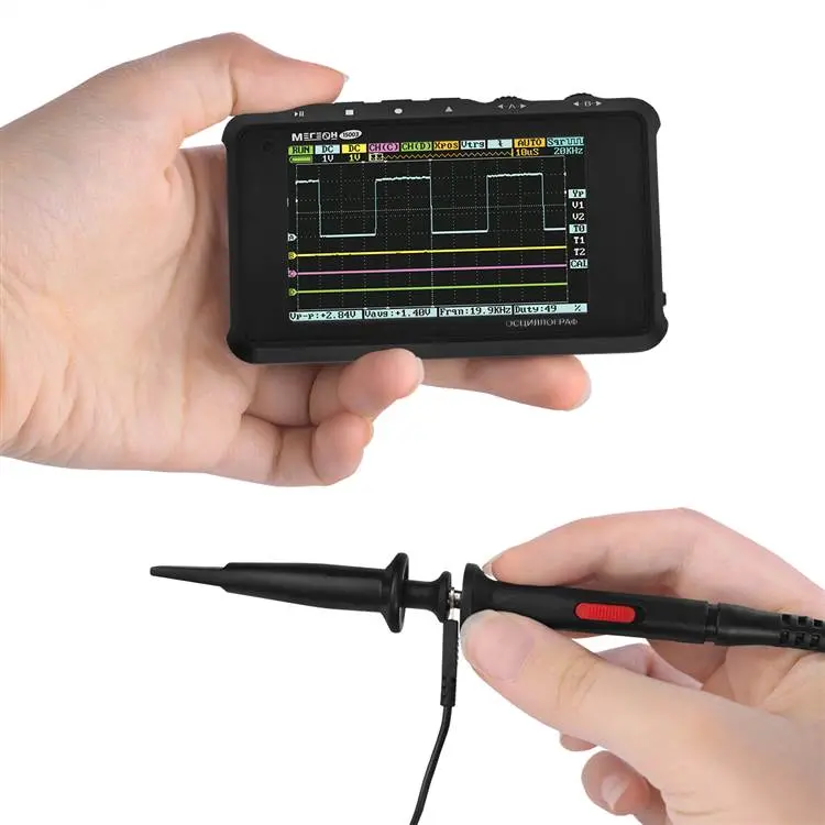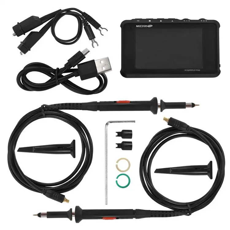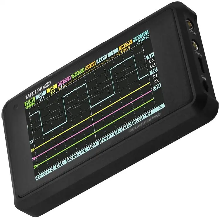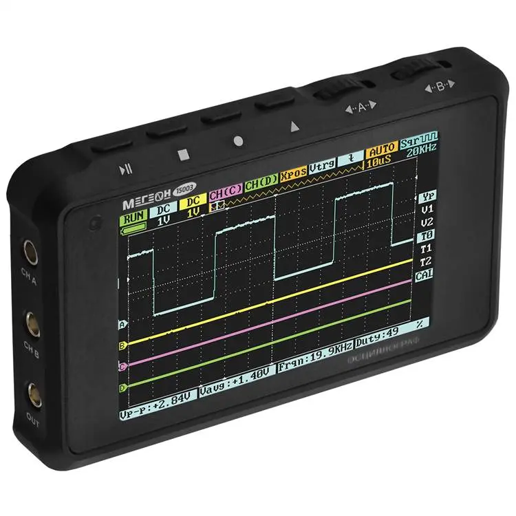 Портативный осциллограф МЕГЕОН 15003 оборудован двумя аналоговыми входами, которые выдерживают напряжение до 40 В, и двумя цифровыми каналами, рассчитанными на сигнал до 5 В. Наличие в комплекте щупов с переключаемым делителем расширяет рабочий диапазон прибора. Цветной дисплей обеспечивает высокую наглядность за счет отображения сигналов в разных каналах, на выходе генератора, горизонтальной развертки и системных индикаторов различными цветами. Поддерживается однократная, ждущая, непрерывная и медленная развертка с разными вариантами запуска, в том числе с регулировкой уровня – для аналоговых каналов. Реализованы функции сравнения, инвертирования, а также базовых математических и логических операций с сигналами в разных каналах.