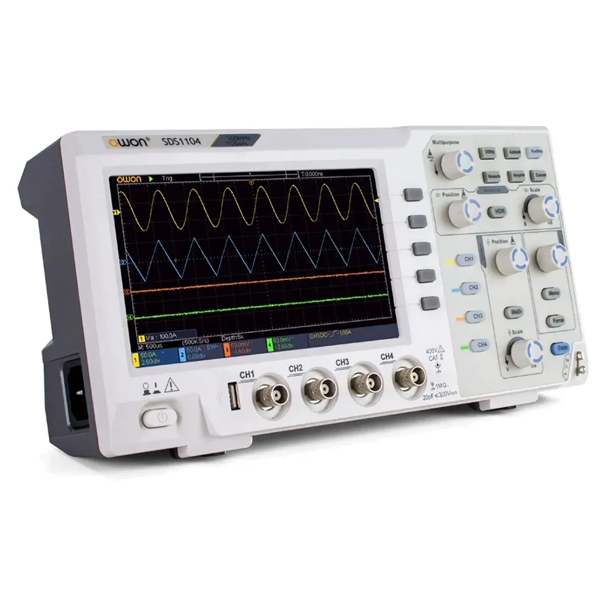 Цифровой осциллограф OWON SDS1104 с полосой пропускания 100 МГц и частотой дискретизации 1 Гвыб/с относится к настольным лабораторным инструментам базового уровня, которые предназначены для решения широкого круга рутинных измерительных задач. В отличие от других изделий серии SDS1000, он оборудован четырьмя аналоговыми каналами, что расширяет его диагностические возможности, позволяя отслеживать и анализировать несколько сигналов одновременно. Благодаря компактному размеру и плоскому исполнению корпуса прибор не загромождает пространство на рабочем месте, а за счет достаточно небольшого веса, немногим более 1 кг, его можно брать с собой на выездные работы в качестве инструмента для диагностики и отладки электронных устройств и электросилового оборудования.