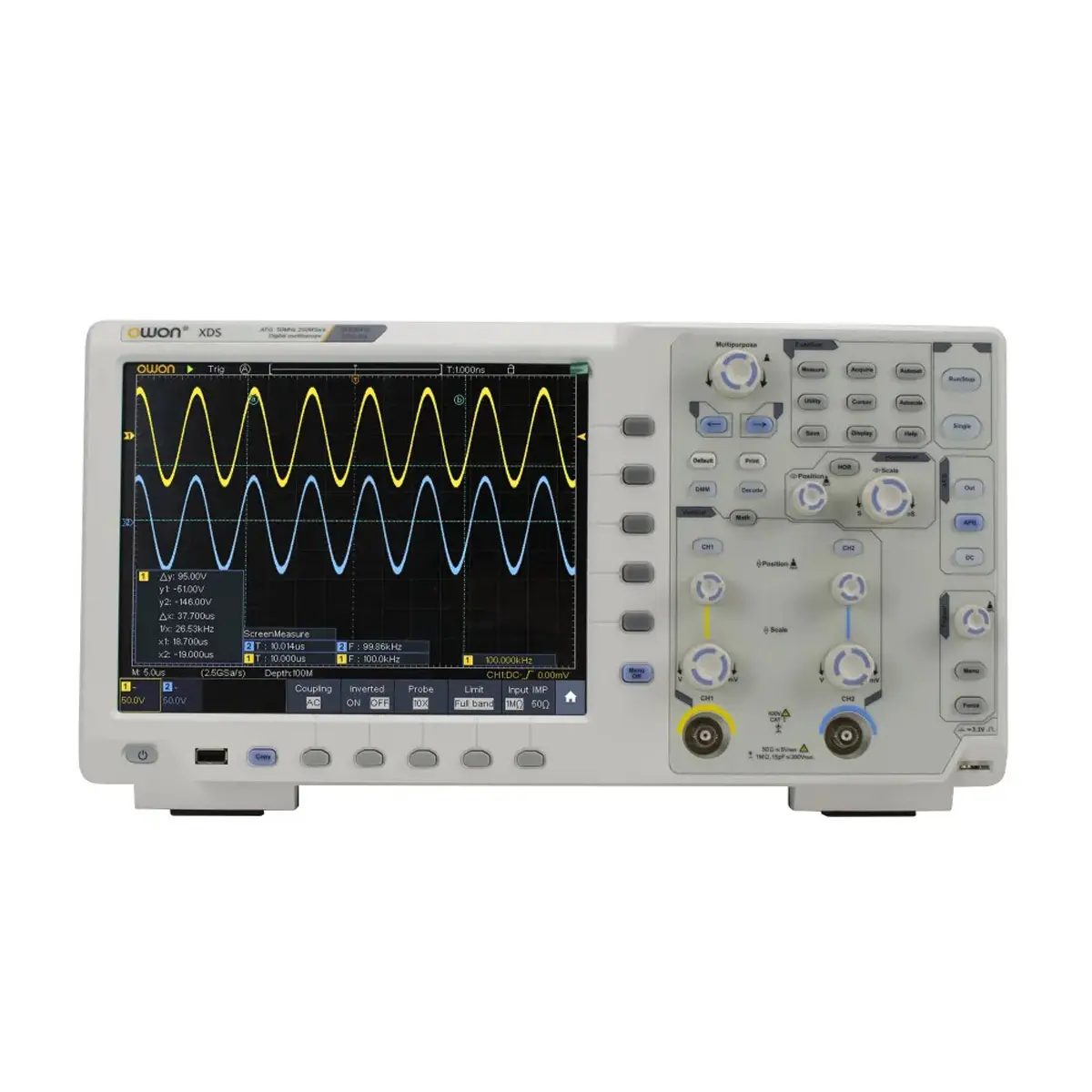 OWON XDS4352 также оснащен множеством математических функций, включая сложение, вычитание, умножение, деление и быстрое преобразование Фурье. Эти функции позволяют выполнять сложные вычисления и анализировать сигналы на более глубоком уровне, что особенно полезно при исследовании нестандартных сигналов или при необходимости проводить спектральный анализ.