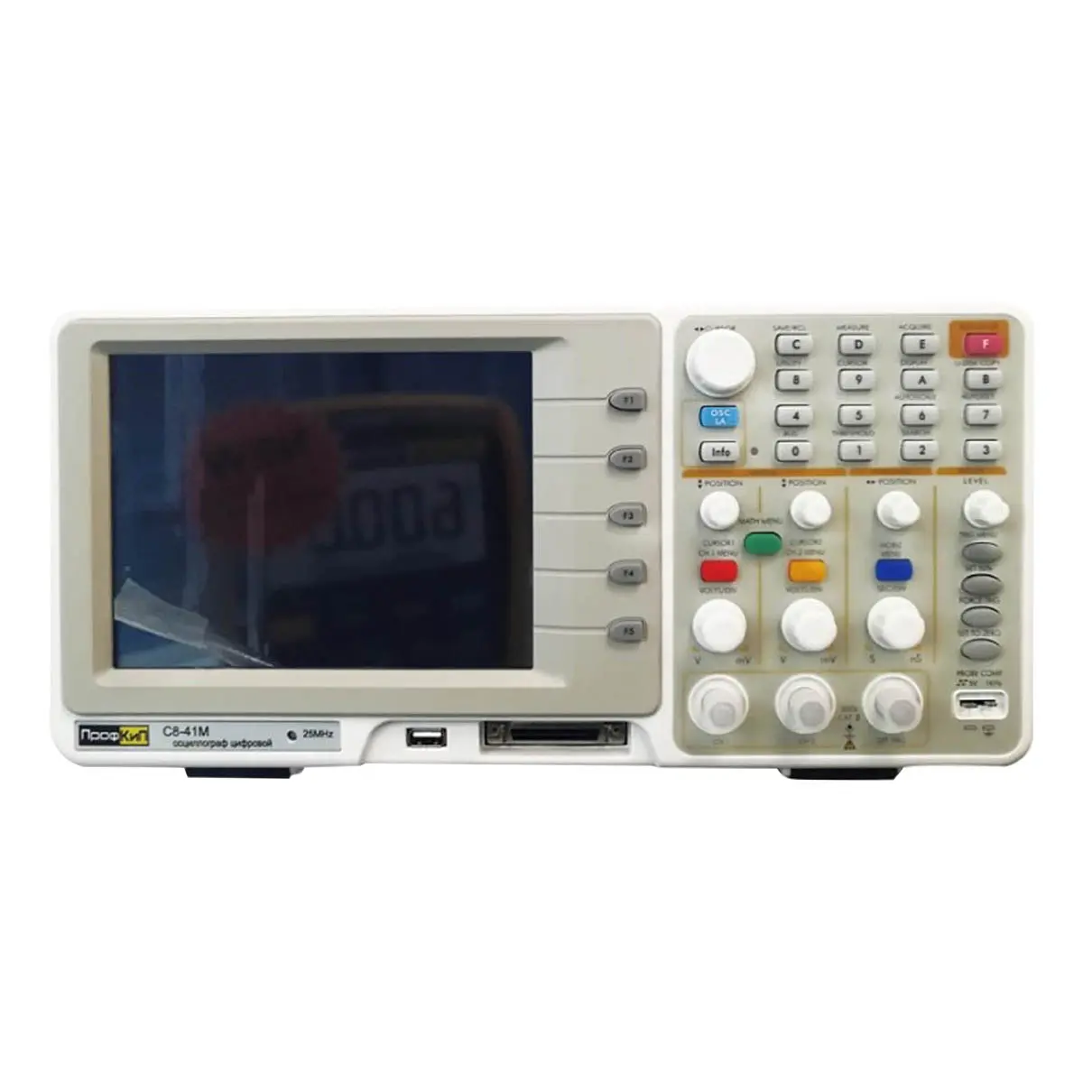 Осциллограф цифровой ПрофКиП С8-41М предназначен для наблюдения и измерений параметров формы сигнала в полосе пропускания до 25 МГц с максимальной частой дискретизации в реальном времени 100 МГц. Осциллограф цифровой ПрофКиП С8-41М может применяться для испытаний, обслуживания в полевых условиях, для исследований и разработки, для любых проверок и выявления неисправностей аналоговых /цифровых схем, для образовательных целей, исследования низкочастотных сигналов и т.д.