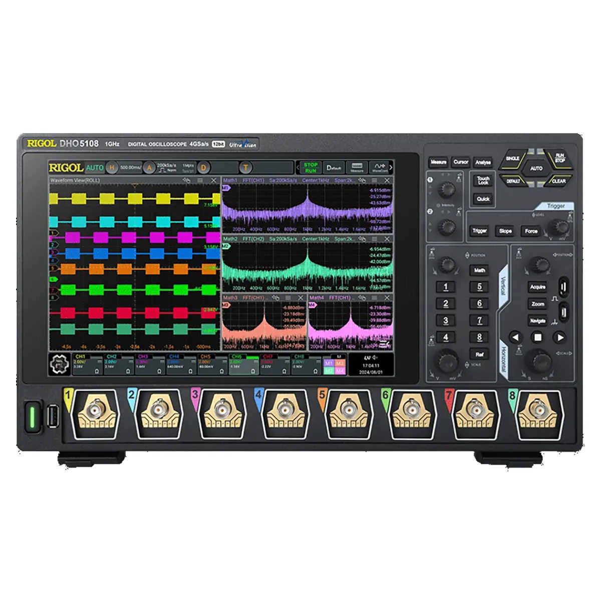 | Автоматическое измерение | Количество измерений: -41 (в том числе до 14 измерений могут отображаться одновременно на экране). -Источник измерения: CH1 - CH8, Math1 - Math 4 -Диапазон измерений Основной вид, увеличение. Измерения: -Отображает 33 элемента измерения (вертикальные и горизонтальные) для текущего канала измерения; результаты измерений обновляются непрерывно. Вертикальные измерения: -Vmax, Vmin, Vpp, Vtop, Vbase, Vamp, Vupper, Vmid,Vlower, Vavg, VRMS, Per. VRMS, превышение, предварительная загрузка, область, периодическая область и среднеквадратичное значение переменного тока. Горизонтальные измерения: -период, частота, время нарастания, время спада, +ширина, -ширина, режим работы, -режим работы, количество положительных импульсов, количество отрицательных импульсов, количество нарастающих фронтов, количество падающих фронтов, Tvmax, Tvmin,+Скорость нарастания и -Скорость нарастания. Другие: -задержка (А↑-В↑), задержка (А↑-В↓), задержка (А↓-В↑), задержка(А↓-В↓), фаза (A↑-B↑), фаза(A↑-B↓), фаза (A↓-B↑), и фаза(A↓-B↓) Статистика: -элементы: текущее, среднее, максимальное, минимальное, стандартное отклонение, подсчёт. -Устанавливаемое статистическое время |