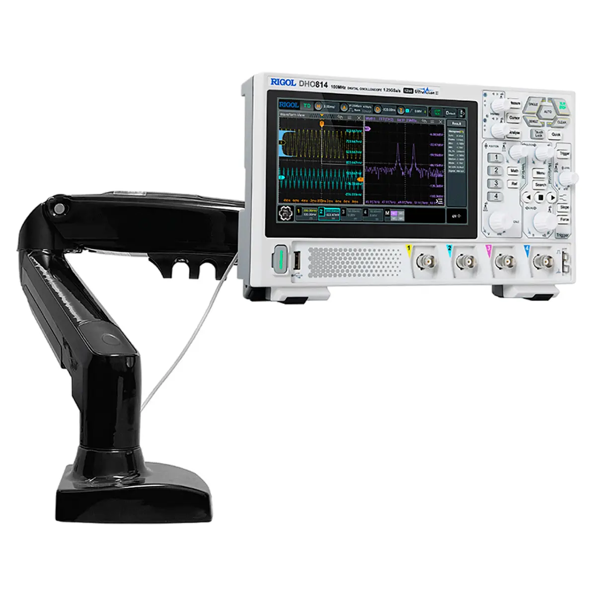 Цифровой осциллограф RIGOL DHO814 – компактный прибор с 7-дюймовым сенсорным дисплеем, который отличается от других лабораторных устройств своего ценового диапазона улучшенными характеристиками и расширенной функциональностью. Он оснащен четырьмя аналоговыми каналами с полосой пропускания 100 МГц и обеспечивает 12-битное разрешение по вертикали при максимальной частоте дискретизации 1,25 Гвыб/с на один канал и при скорости захвата до 1 000 000 осциллограмм/с, обеспечивая возможность визуального исследования динамичных сигналов сложной формы при решении широкого круга задач. Расширенный набор интерфейсов позволяет легко интегрировать изделие в состав измерительных систем и автоматизированных установок, обеспечивая совместное функционирование с другим лабораторным и компьютерным оборудованием.