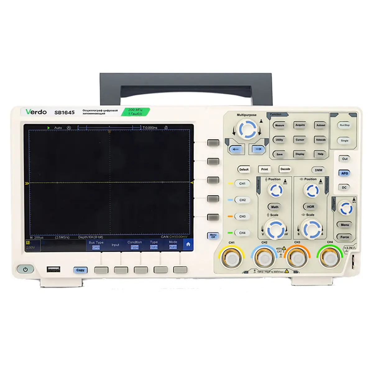 Осциллограф цифровой VERDO SB1645 представляет собой 4-канальный настольный прибор в компактном корпусе, с полосой пропускания 100 МГц и частотой дискретизации до 1 Гвыб/с, базовая функциональность которого может гибко наращиваться за счет выбора дополнительных аппаратных опций. По сравнению с младшими модификациями линейки SB164x, данное изделие обладает повышенным показателем максимальной частоты захвата, до 70 000 осц./с, и расширенным диапазоном регулировки временной шкалы, позволяя задавать горизонтальный масштаб с нижним пределом от 1 нс/дел. Благодаря этому устройство точнее отображает форму динамичных быстроменяющихся сигналов и способно регистрировать кратковременные события.