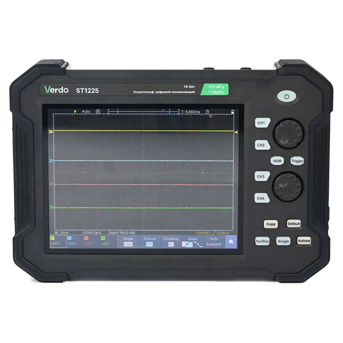 VERDO ST1225 – это двухканальный цифровой осциллограф планшетного типа. Его плоский, компактный корпус, напоминающий прочный планшет, предназначен для удобного использования в любых условиях – от строительной площадки до производственного цеха. Забудьте о громоздких приборах и неудобных кейсах, эта модель легко помещается в сумке или рюкзаке
