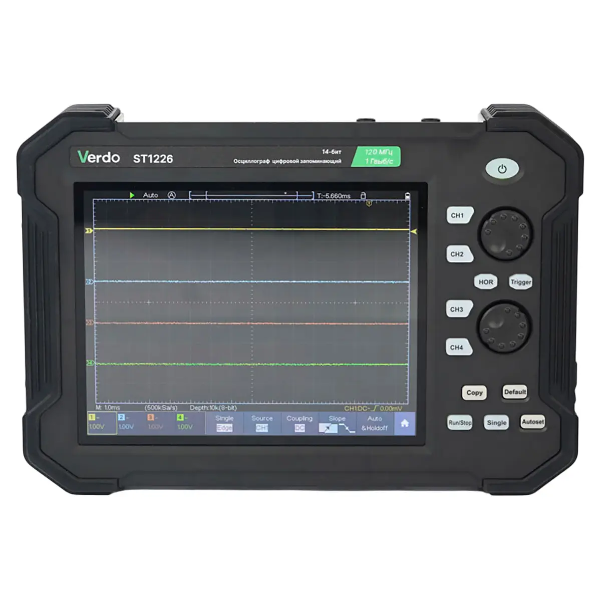 За компактными размерами VERDO ST1226 скрывается мощный функционал, сравнимый с большими стационарными осциллографами. Он позволяет проводить измерения на четырех каналах одновременно, обеспечивая всесторонний анализ сигналов. Высокоскоростной АЦП с переключаемым разрешением 8/12/14 бит гарантирует высокую точность измерений. Прибор также оснащен встроенным мультиметром с функцией регистратора данных, что значительно расширяет его возможности.