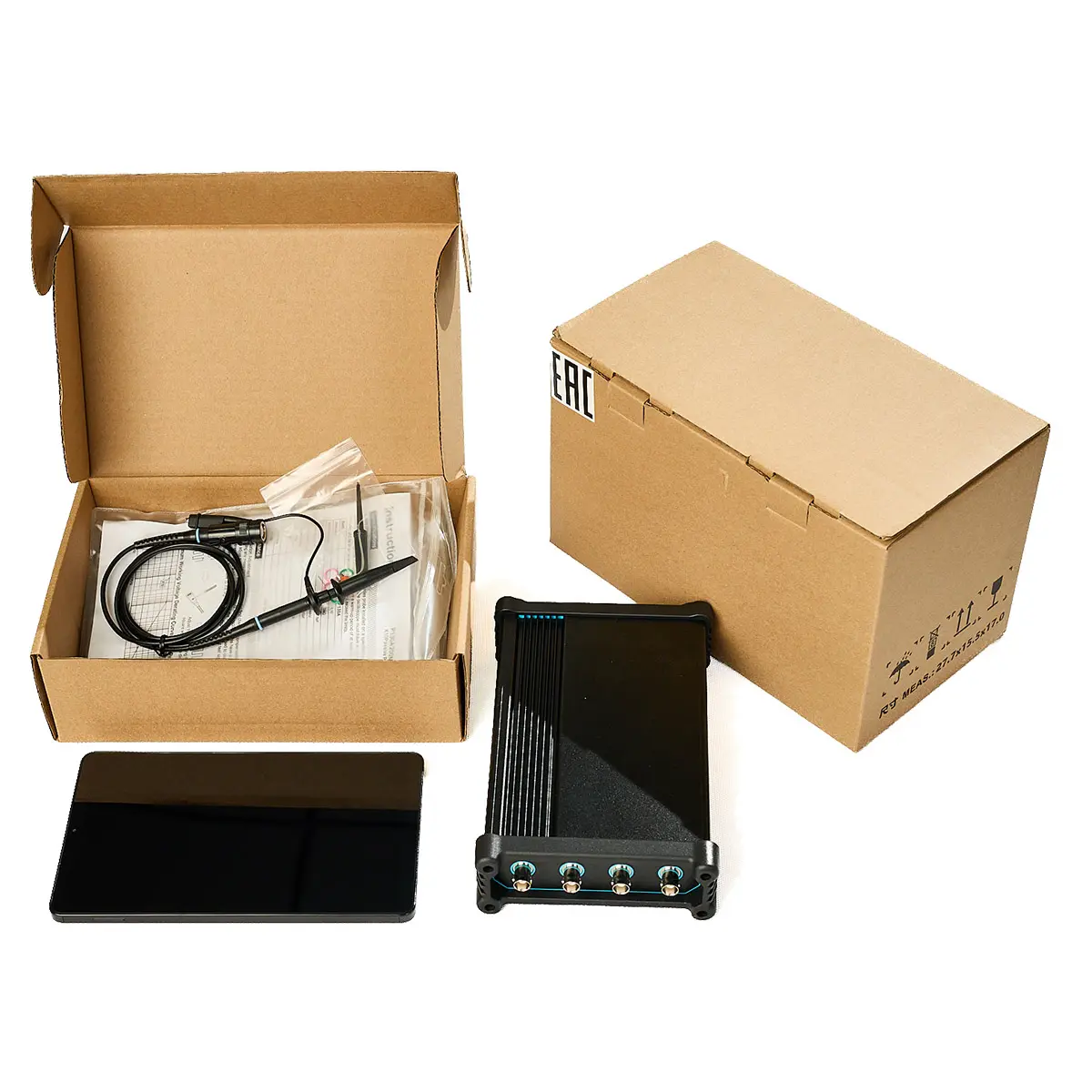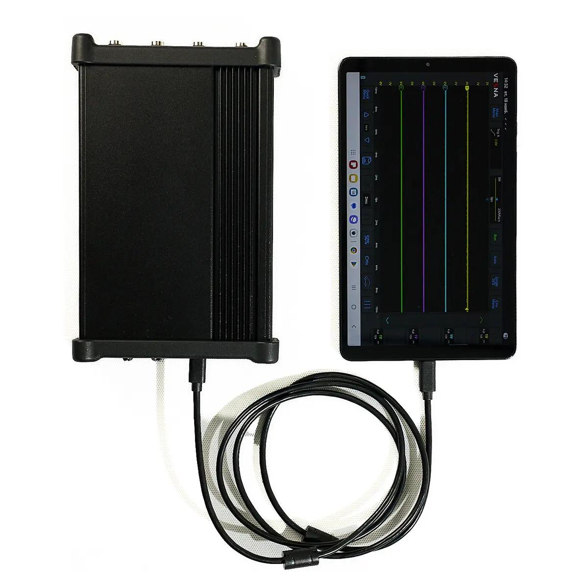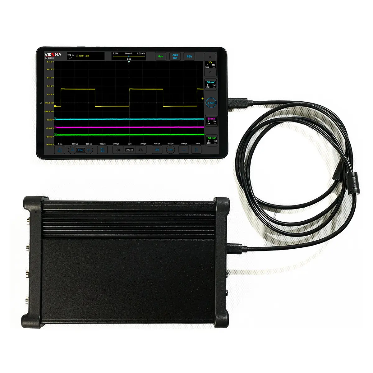Цифровой осциллограф не имеет собственного дисплея — вместо этого он передает данные по Wi-Fi или USB на внешнее устройство. Это позволяет размещать прибор в стесненных условиях (например, внутри испытательной камеры) и управлять им дистанционно. Программное обеспечение предоставляет все функции стационарного аналога: курсорные измерения, математические операции, FFT-анализ, триггер по протоколу.