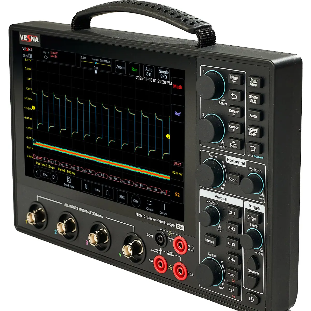 Цифровой осциллограф идеально подходит для отладки микроконтроллерных плат, промышленных контроллеров, систем управления и цифровых интерфейсов. Четыре канала позволяют одновременно отслеживать питание, тактовые импульсы, данные и управляющие сигналы — без необходимости синхронизации нескольких приборов. Это особенно ценно при диагностике временных рассогласований или помех в многоканальных системах.