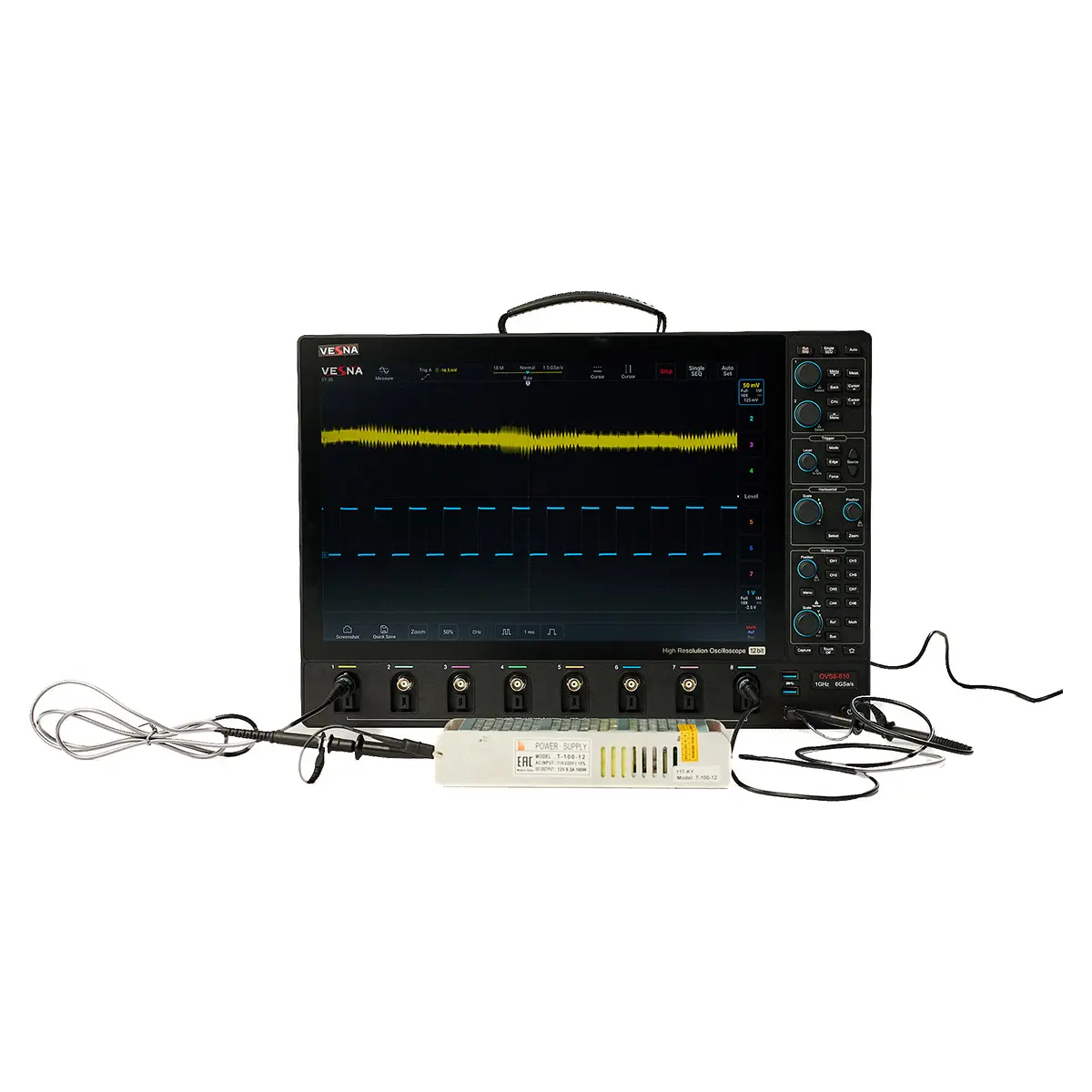 Благодаря восьми каналам, цифровой осциллограф позволяет одновременно отслеживать сигналы управления, силовые ключи, датчики и шины связи — например, в системе управления электродвигателем или промышленном контроллере. Это исключает необходимость синхронизации нескольких осциллографов и устраняет риск ошибок при анализе временных соотношений.