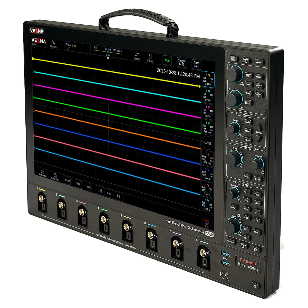 Осциллограф VESNA OVS6-810 — это флагман линейки профессиональных измерительных приборов, предназначенный для самых сложных задач в области разработки, отладки и сертификации высокоскоростной электроники. С полосой пропускания 1 ГГц, частотой дискретизации до 6 Гвыб./с и 12-битным АЦП, он обеспечивает беспрецедентную детализацию даже самых быстрых и слабых сигналов. Благодаря восьми независимым аналоговым каналам, прибор позволяет одновременно анализировать многоуровневые системы — от многоканальных цифровых шин до сложных аналогово-цифровых интерфейсов.