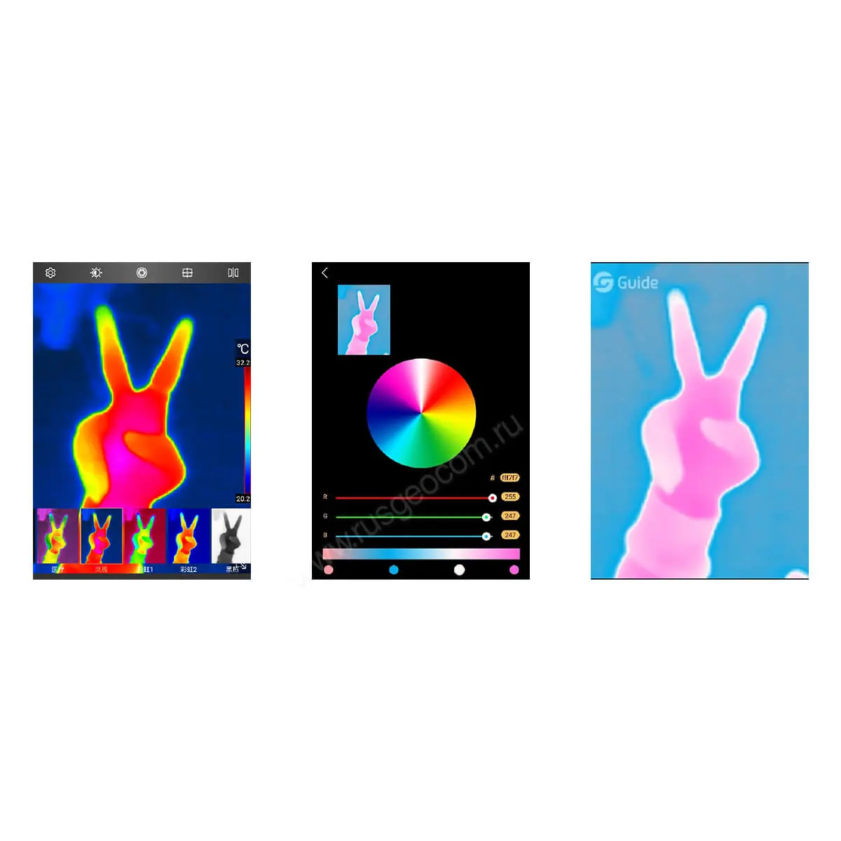 Вы можете использовать предустановленные палитры или настроить свой собственный цвет для каждой температурной зоны. Эта функция позволяет создавать более интересные и красочные тепловизионные видеоролики и фотографии. Также вы можете регулировать диапазон определяемых температур, чтобы выделить малозаметные объекты или уменьшить шум на изображении.