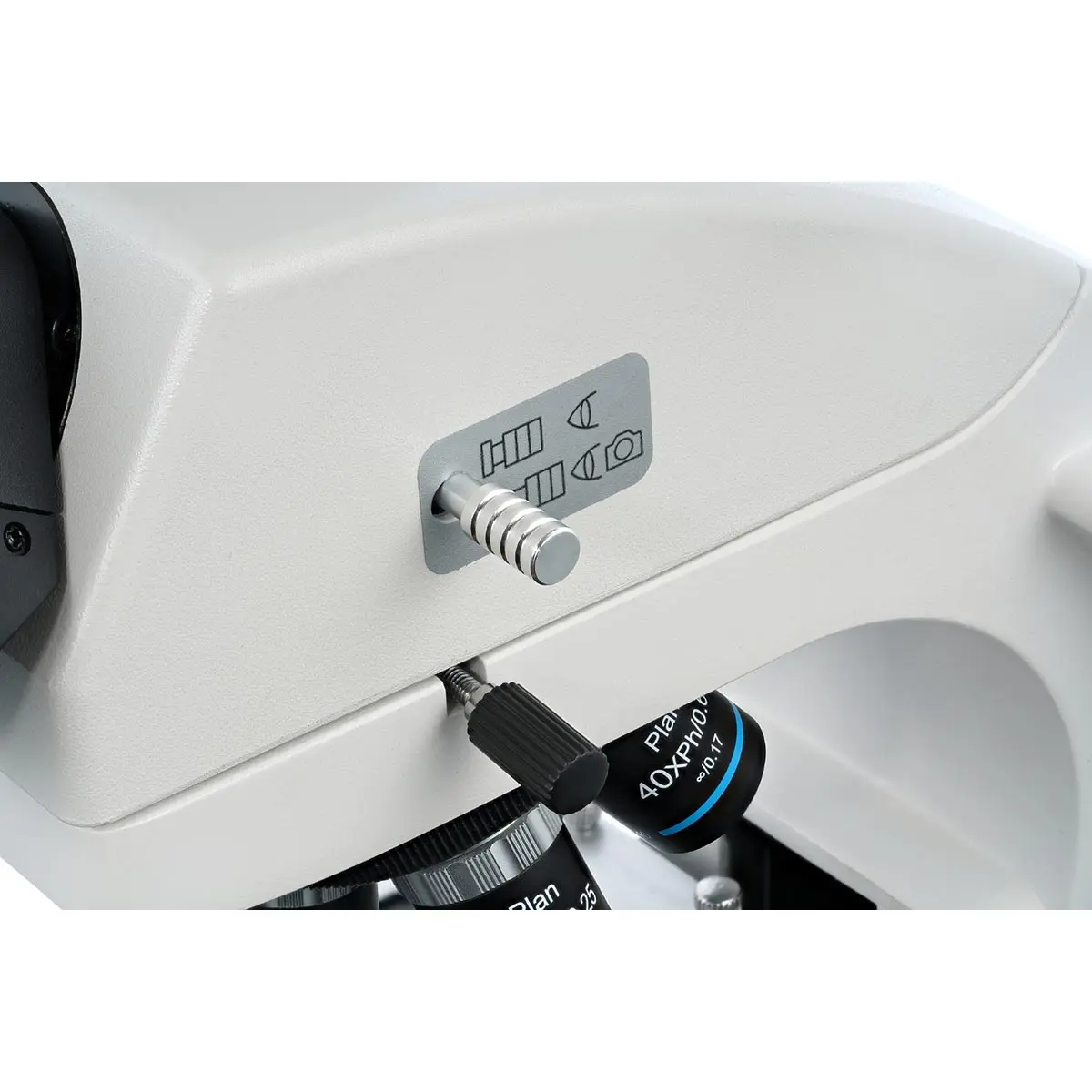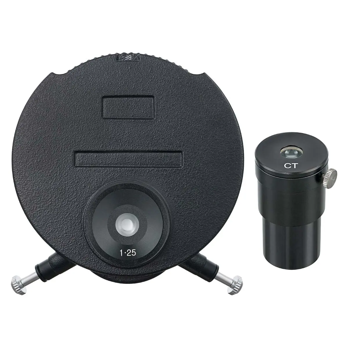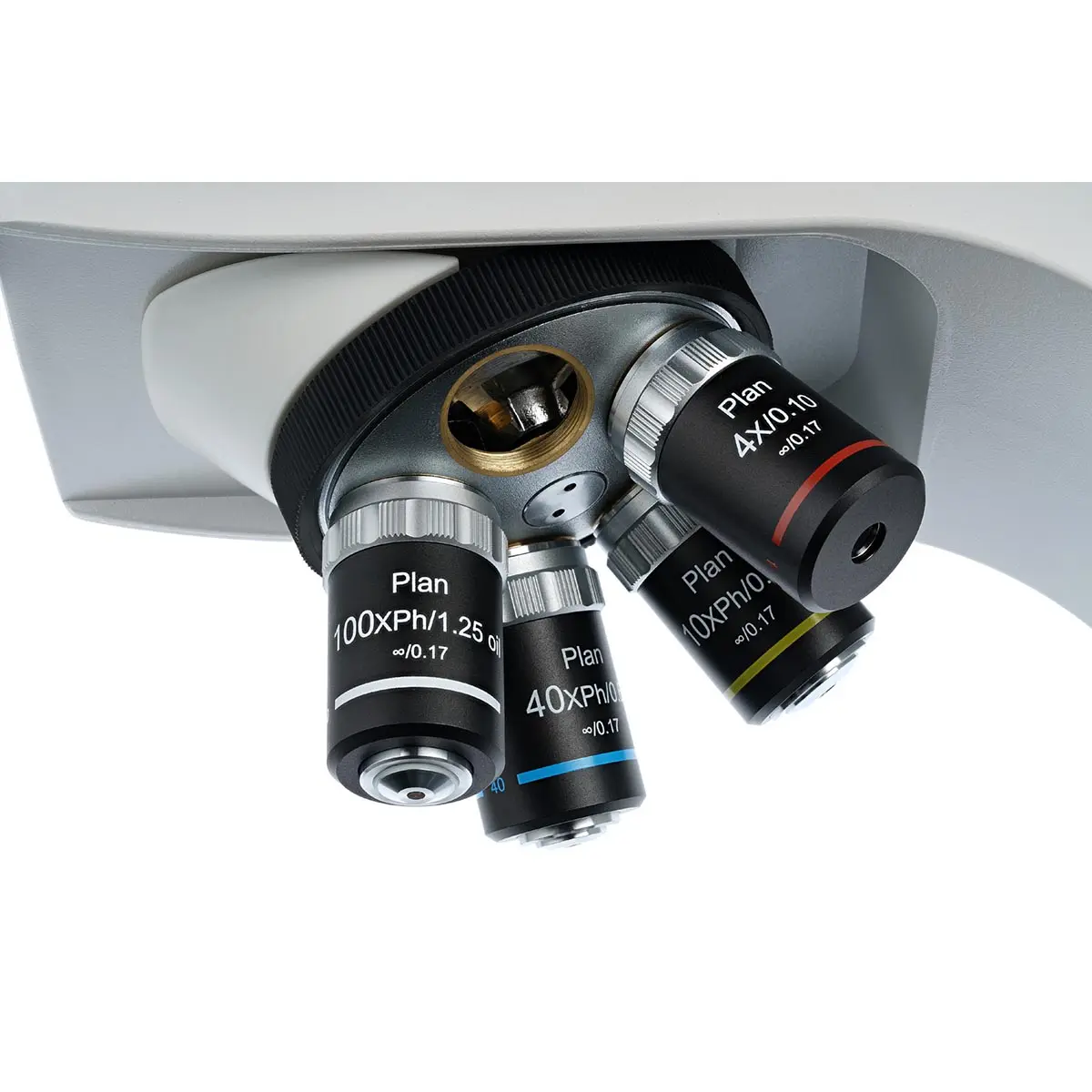 В револьверное устройство можно устанавливать до пяти объективов, в комплект включены четыре фазовых планахроматических объектива. В передаваемом изображении не проявляются оптические искажения, поле плоское и четкое. Защитные пружинящие оправы есть у двух объективов – с увеличениями 40х и 100х. 100-кратный объектив используется для масляной иммерсии. Все оптические поверхности аксессуаров сделаны из стекла с антигрибковым покрытием. При использовании планахроматических микроскопов клинические исследования проводить значительно удобнее, так как значительно увеличивается детализация изображения.