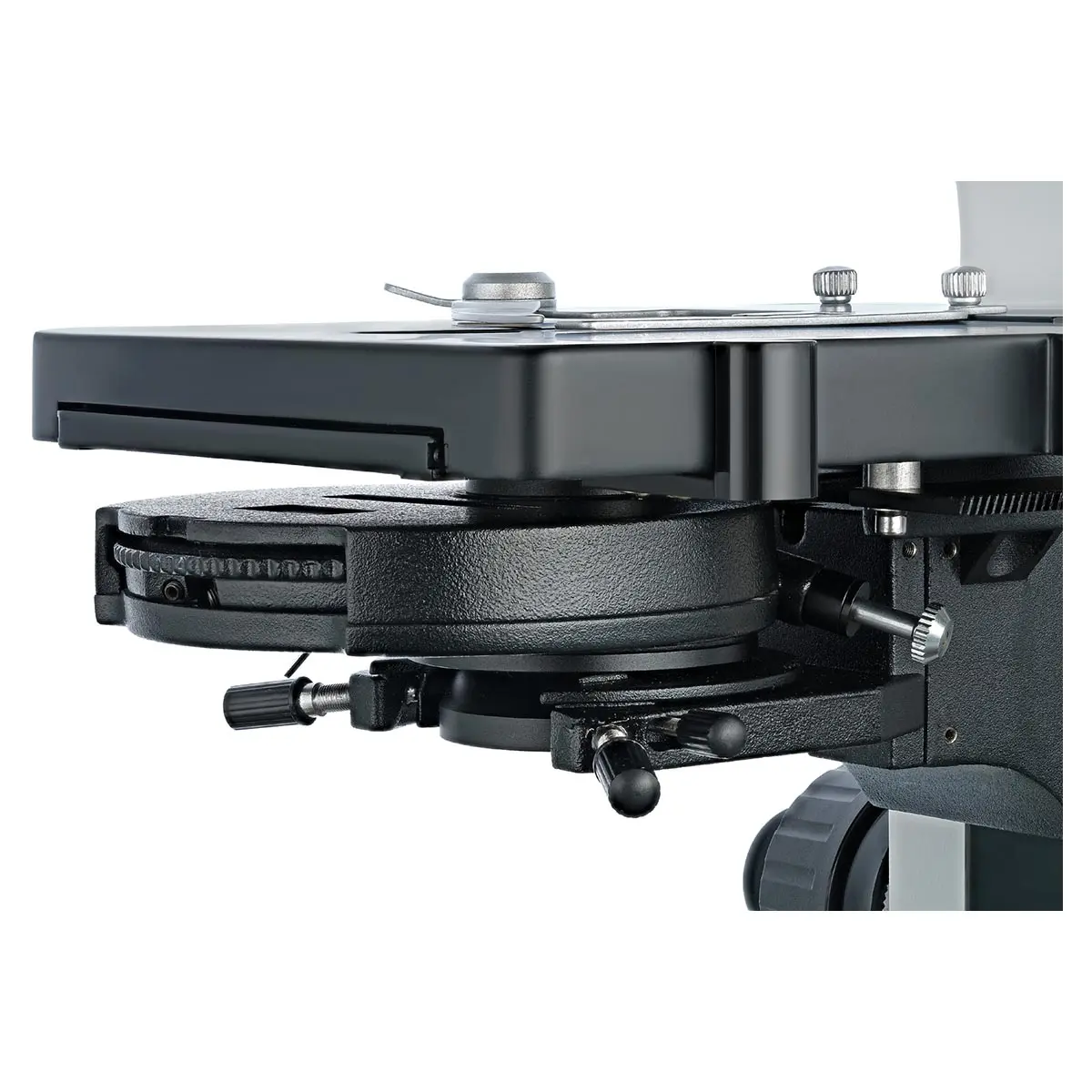 Предметный столик снабжен препаратоводителем, который делает работу с образцами более удобной. Рядом находятся ручки грубой и точной фокусировки. Под столиком расположены фазовый конденсор, держатель фильтра и яркая светодиодная подсветка, работающая от сети переменного тока. Яркость подсветки можно регулировать.