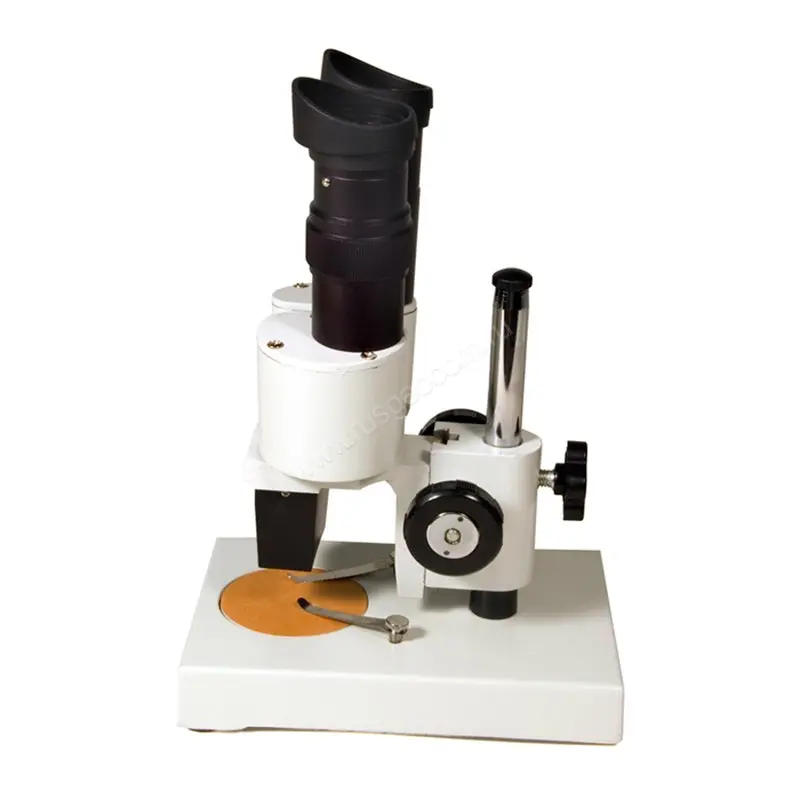 Для освещения используется естественный свет, направленных сверху на объект. Резкость удобно устанавливается посредством поворотного регулятора. Конструкция стереомикроскопа не предусматривает возможности исследования в проходящем свете. Он лучше других моделей подходит именно для прикладных работ с объемными предметами. Прибор совместим с фирменными цифровыми камерами.