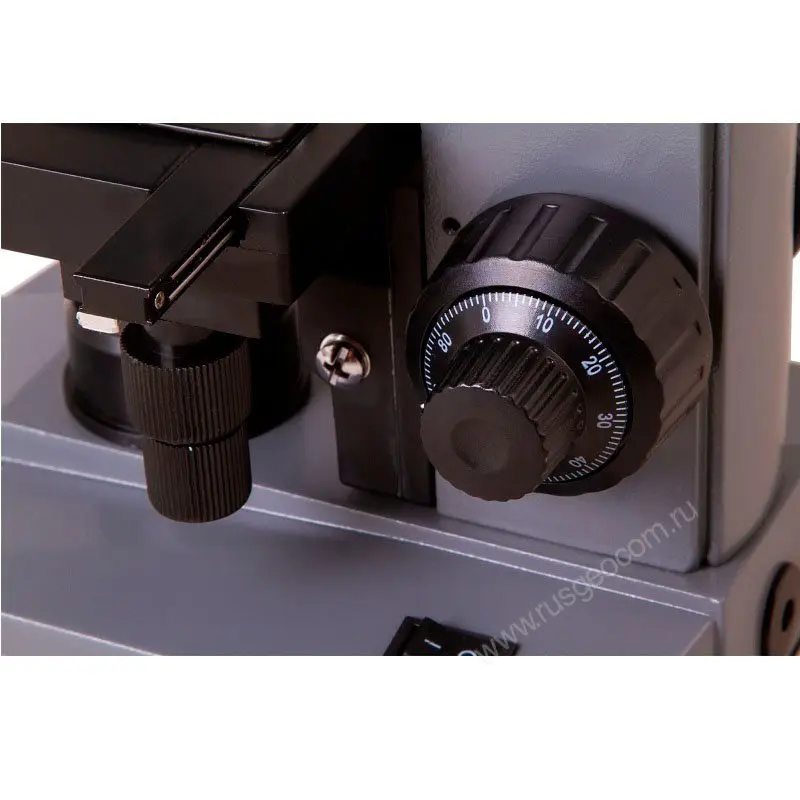 Для удобного размещения изучаемого материала предметный столик прибора оборудован препаратоводителем, под которым распологается конденсор Аббе. Для комфортного наблюдения вы можете регулировать яркость подсветки, которая может работать как от сети переменного тока, так и от входящих в комплект батареек, одного заряда которых хватает на 10 часов бесперебойной работы.