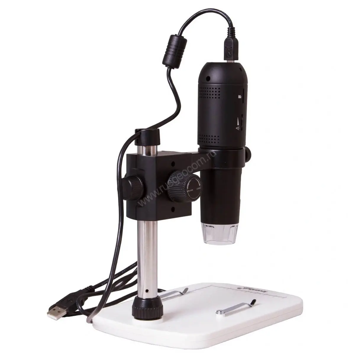 Для фиксации и точной работы цифрового микроскопа используется штатив с вертикальной стойкой. Он оснащен стопорным винтом и "микролифтом" – механизмом плавного изменения высоты прибора для настройки резкости изображения. Дополнительный фиксатор фокусировки позволяет закрепить прибор в нужном положении, что исключает случайное изменение настроек при продолжительной работе. Предметный столик оснащен подпружиненными фиксаторами и имеет миллиметровую двухкоординатную шкалу.