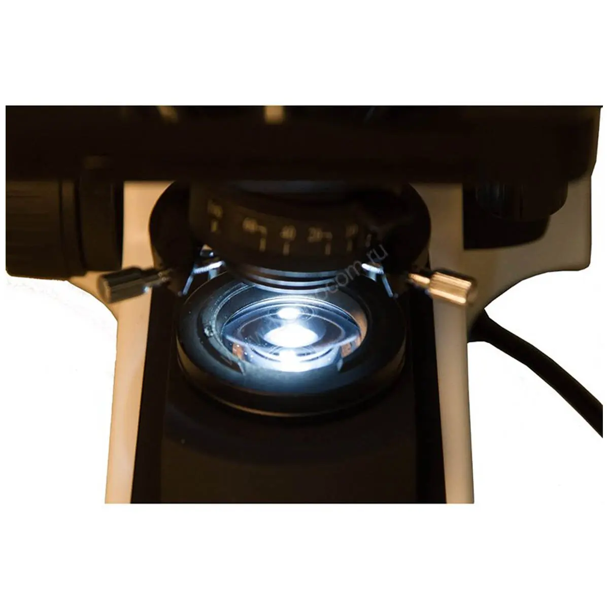 Помимо конденсора Аббе с собственной ирисовой диафрагмой, который можно центрировать и регулировать по высоте, полевой диафрагмой оборудован и светодиодный источник света.