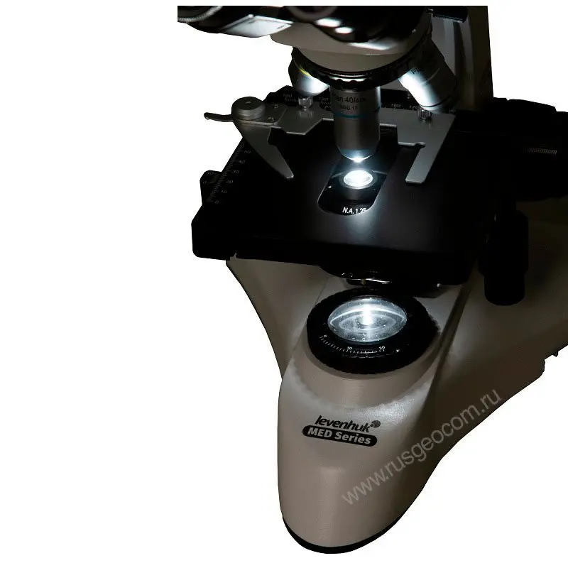 Исследование бактерий, других живых микроорганизмов и прозрачных объектов возможно благодаря наличию в комплекте биологического микроскопа Levenhuk MED 25T темнопольного конденсора, который можно установить на место стандартного. При наблюдении таким способом исследуемый материал отображает а темном поле.