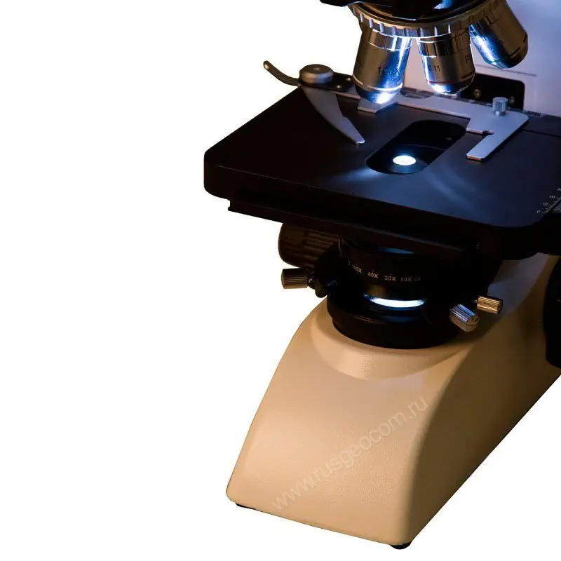 Конструкция предметного столика лабораторного микроскопа для удобного размещения образца оснащена препаратоводителем, под которым находится галогенная подсветка, которая функционирует от сети переменного тока. Такой тип подсветки более приятен человеческому глазу, в отличие от светодиодного. В систему подсветки также входит конденсор Аббе с диафрагмой и держателем фильтра.