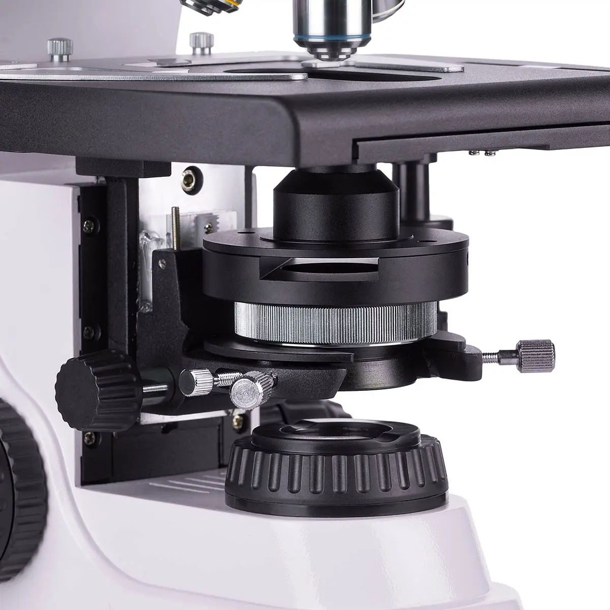 Фокусировка микроскопа осуществляется с помощью коаксиальных рукояток грубой и тонкой фокусировки. Это позволяет пользователю плавно и без усилий настраивать фокусировку. Кроме того, предметный столик не имеет выдвижной зубчатой рейки по оси Х, что повышает эргономичность работы. Механизм с ременной передачей плавно перемещает объект, а препаратодержатель крепится двумя винтами, обеспечивая быструю и удобную замену образцов.