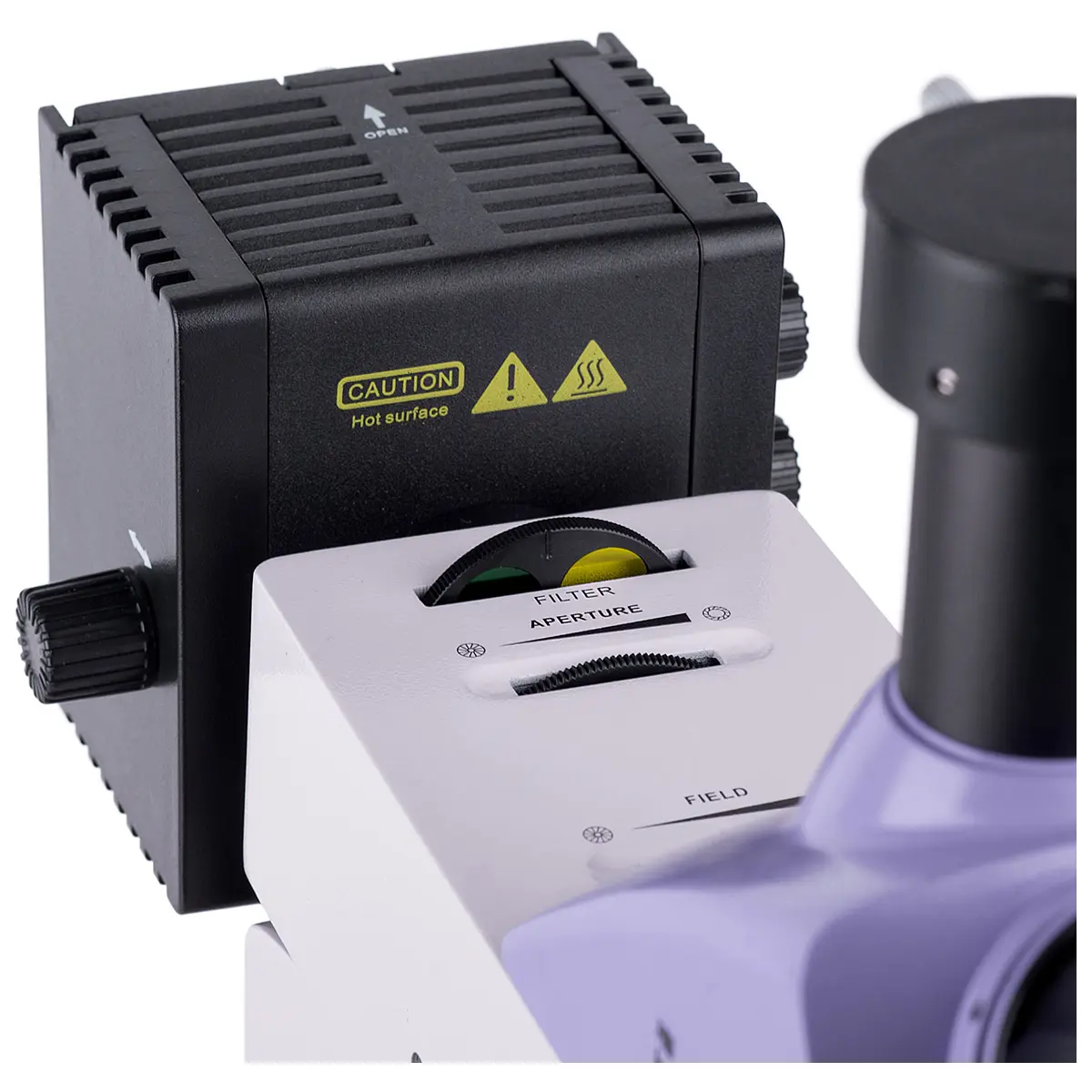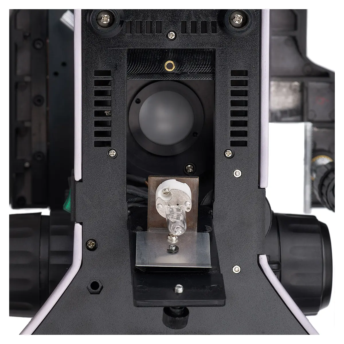 Прибор оснащен револьвером на 5 объективов, что позволяет быстро и легко менять увеличение. Кроме того, свободное отверстие в револьвере позволяет настраивать положение лампы осветителя отраженного света. Это дает исследователю большую гибкость при работе с различными образцами и условиями освещения.
