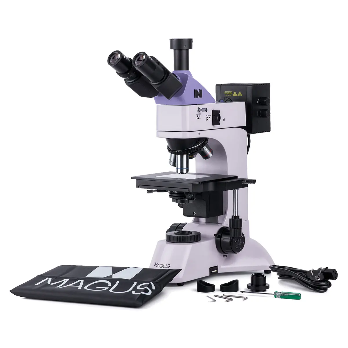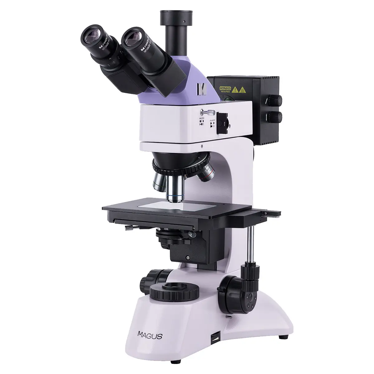 Микроскопа MAGUS обладает галогенным осветителем проходящего света мощностью 30 Вт и галогенным осветителем отраженного света мощностью 50 Вт. Благодаря этому, оборудование предоставляет возможность работать с методами светлого поля, темного поля и простой поляризации. Осветитель отраженного света позволяет изучать полупрозрачные пленки и объекты на фильтрах, такие как пробы воздуха, воды, нефти и других веществ.