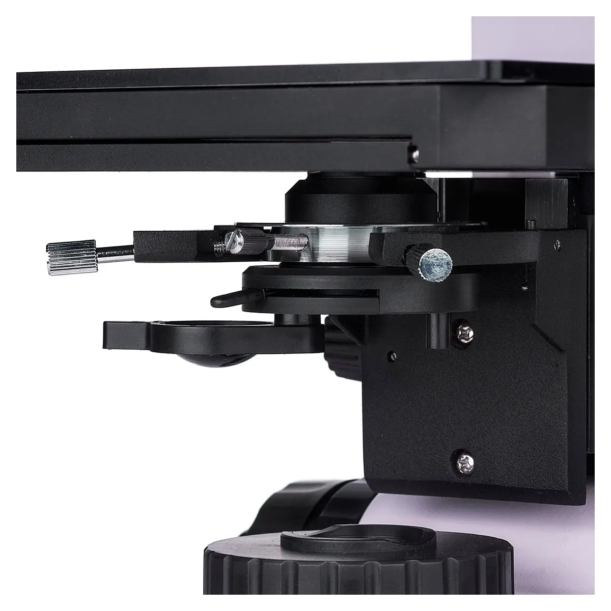 MAGUS Metal 600 BD также оснащен револьверным устройством на 5 объективов. Свободное отверстие револьвера может использоваться для настройки положения лампы осветителя отраженного света и установки дополнительного объектива для получения дополнительного увеличения. Револьвер повернут "от наблюдателя", что обеспечивает свободное пространство над столиком и удобство использования.
