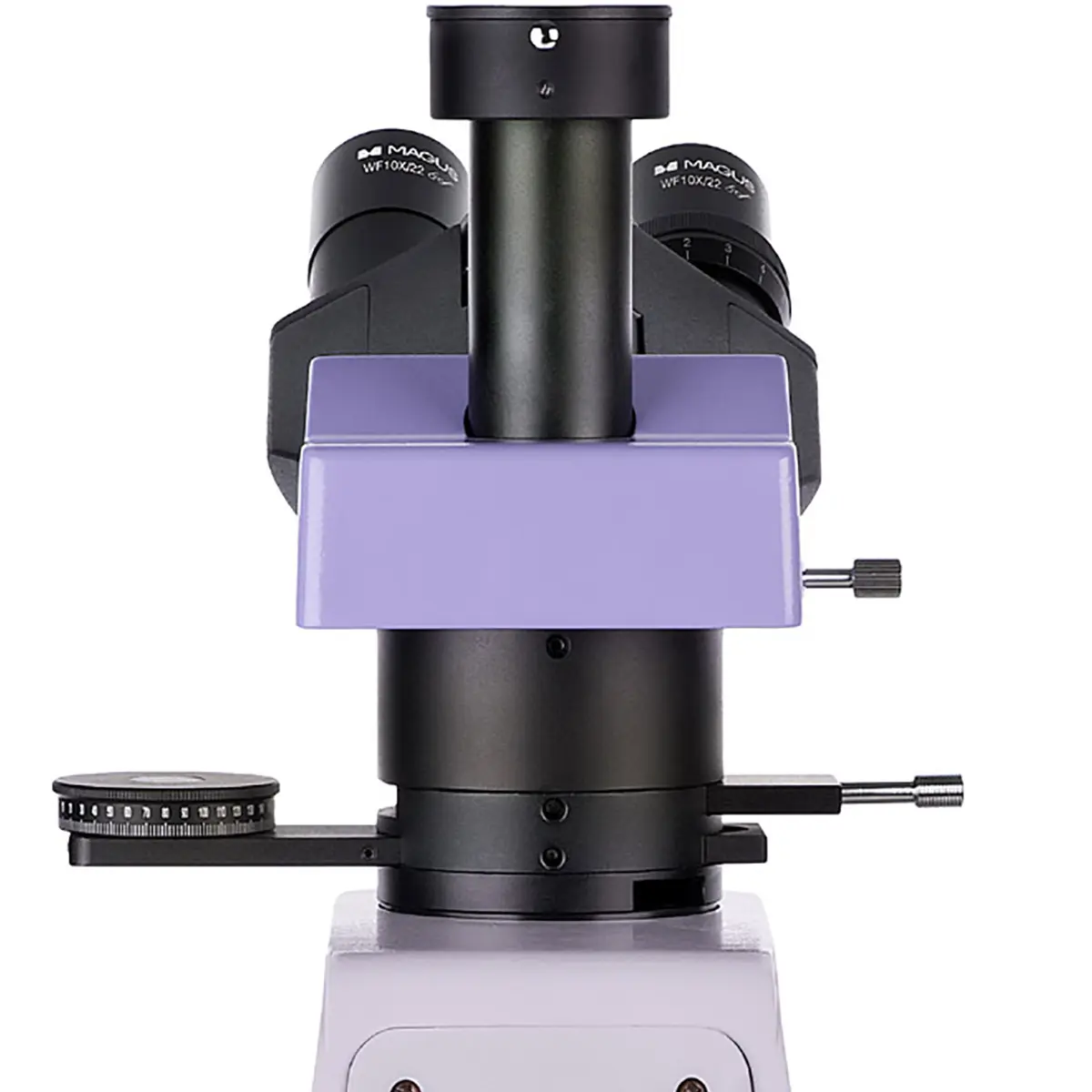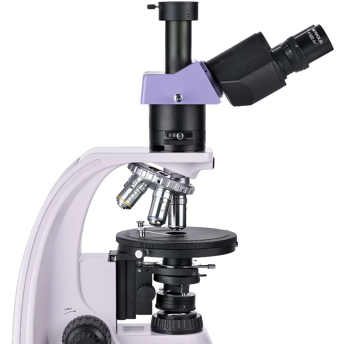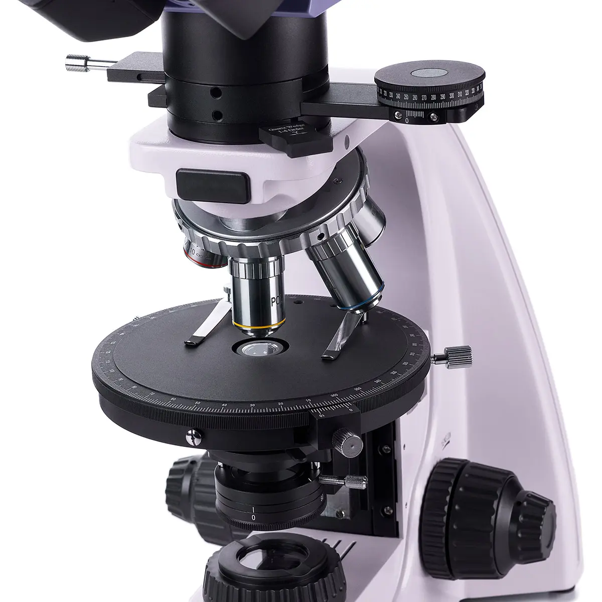 Револьвер на 5 объективов позволяет быстро переключаться между различными увеличениями. Кроме того, в свободное гнездо револьвера микроскопа MAGUS Pol D800 можно установить дополнительный объектив, чтобы получить еще большее увеличение. Конструкция револьвера с наклоном к штативу освобождает пространство в передней части предметного столика, что облегчает работу и позволяет пользователю видеть объектив, который ввел в ход лучи.