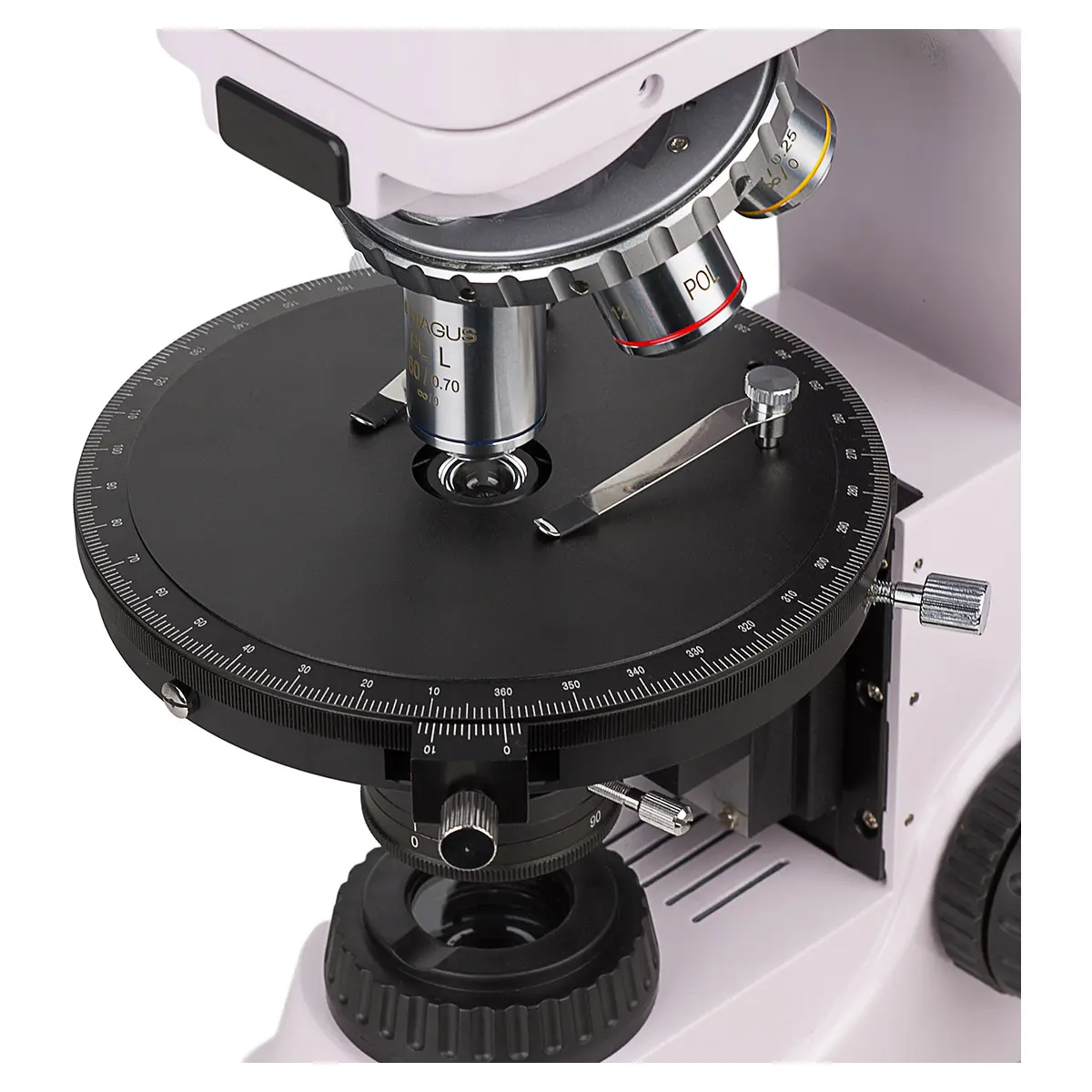 Свободное отверстие на револьвере используется для настройки положения лампы осветителя отраженного света. Кроме того, в свободное гнездо револьвера можно установить дополнительный объектив, чтобы получить дополнительное увеличение. Конструкция револьвера с наклоном к штативу освобождает переднюю часть предметного столика, что позволяет пользователю видеть объектив, который используется для наблюдения.
