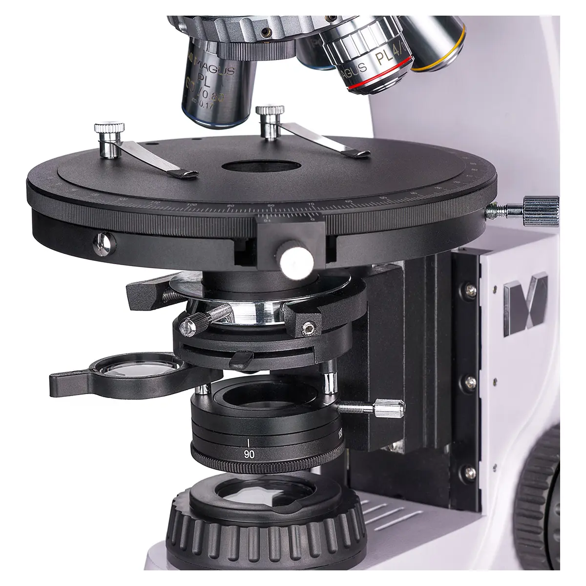 Микроскоп MAGUS Pol 800 работает на принципе проходящего света. В качестве источника света используется галогенная лампа мощностью 30 Вт, обеспечивающая яркое естественное освещение. Освещение по Кёлеру позволяет получить равномерное и контрастное освещение объектов, что важно для достоверного анализа.