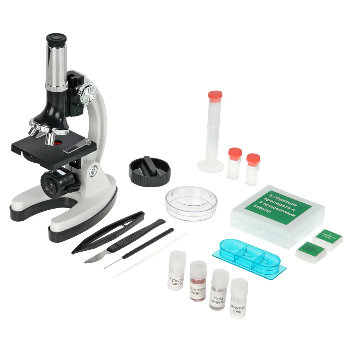 Микроскоп комплектуется продвинутой минилабораторией – в нее входят принадлежности, инструменты и препараты. Весь комплект микроскопа вместе с минилабораторией уложен в специальные ячейки прочного и удобного кейса. К микроскопу прилагается подробная Инструкция, содержащая полезные советы и рекомендации, которые помогут сделать первые шаги в увлекательный Микромир.