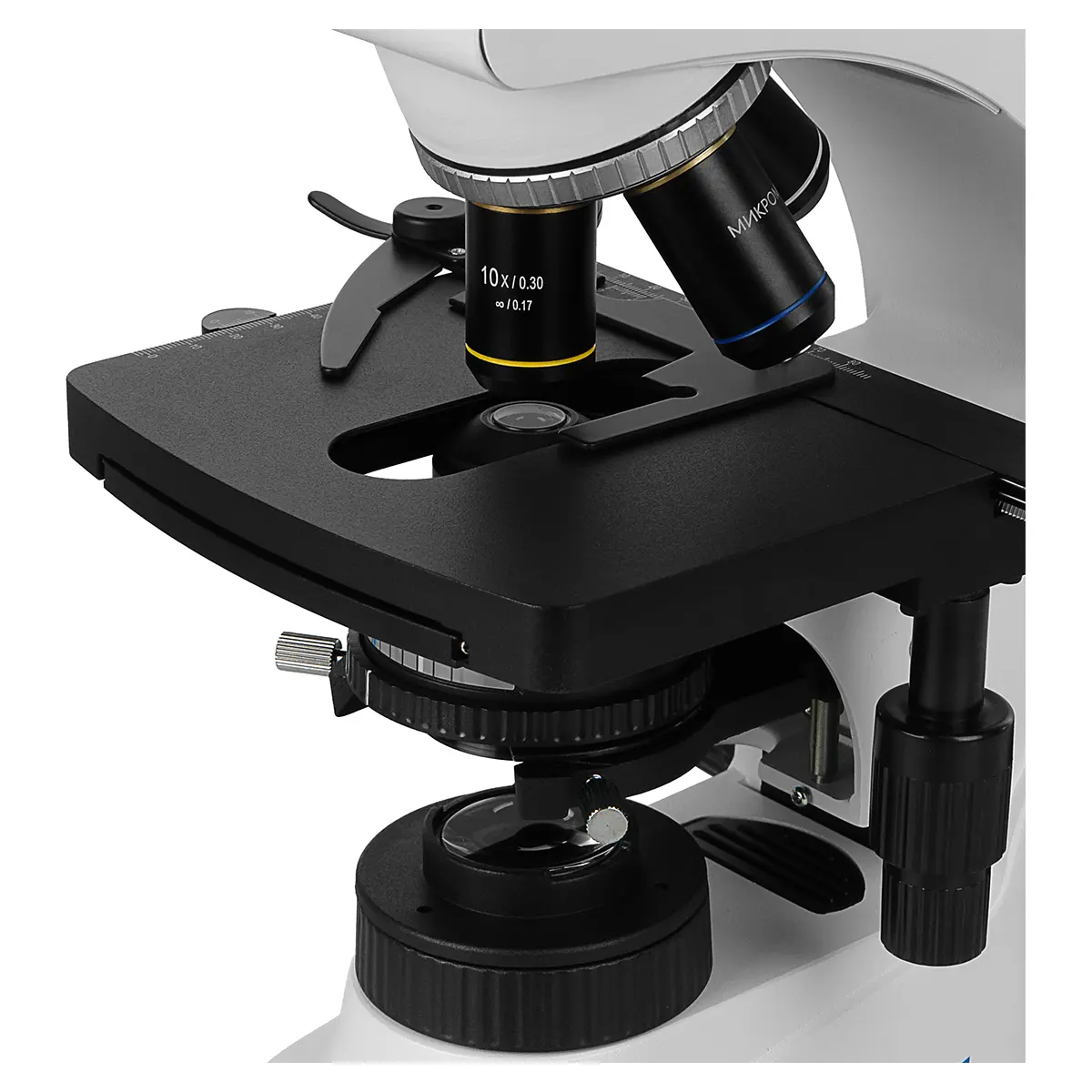 Поворотная конструкция бинокулярной насадки Микромед 2 (3 LED inf.) упрощает проведение групповых исследований. Предметный столик, который можно перемещать в 2 направлениях, снабжен механизмом быстрой фиксации образцов. Предусмотрены конденсор Аббе и полевая диафрагма, которые помогают повысить контрастность изображения.