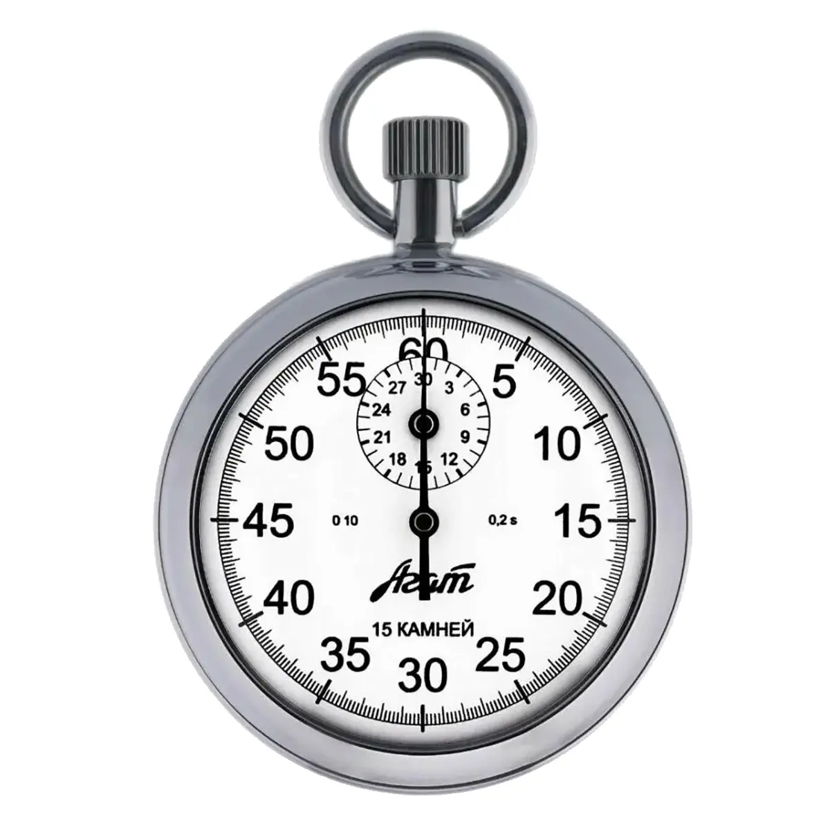 Отсчет времени в секундомере ведется стрелкой по 60-секундной шкале с ценой деления 0,2 секунды. Одновременно с этим производится измерение в минутах на вспомогательном маленьком циферблате. Высокая точность измерений обеспечивается за счет оснащения колебательной системой “баланс-спираль”, используемой в карманных часах, с интервалом 0,4 секунды. Для большей наглядности циферблат и стрелки выполнены в контрастном с остальным корпусом черном исполнении.