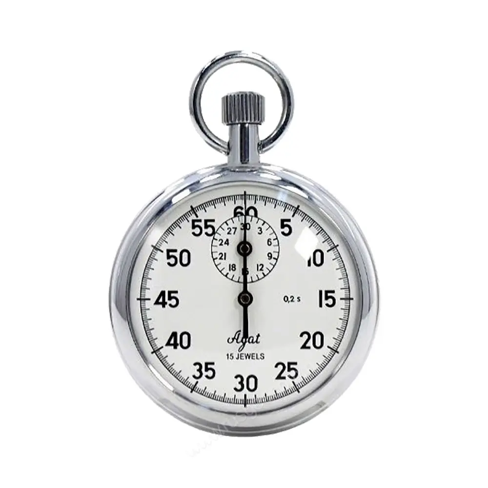 Отсчет времени в секундомере ведется стрелкой по 60-секундной шкале с ценой деления 0,2 секунды. Одновременно с этим производится измерение в минутах на вспомогательном маленьком циферблате. Высокая точность измерений обеспечивается за счет оснащения колебательной системой “баланс-спираль”, используемой в карманных часах, с интервалом 0,4 секунды. Для большей наглядности циферблат и стрелки выполнены в контрастном с остальным корпусом черном исполнении.