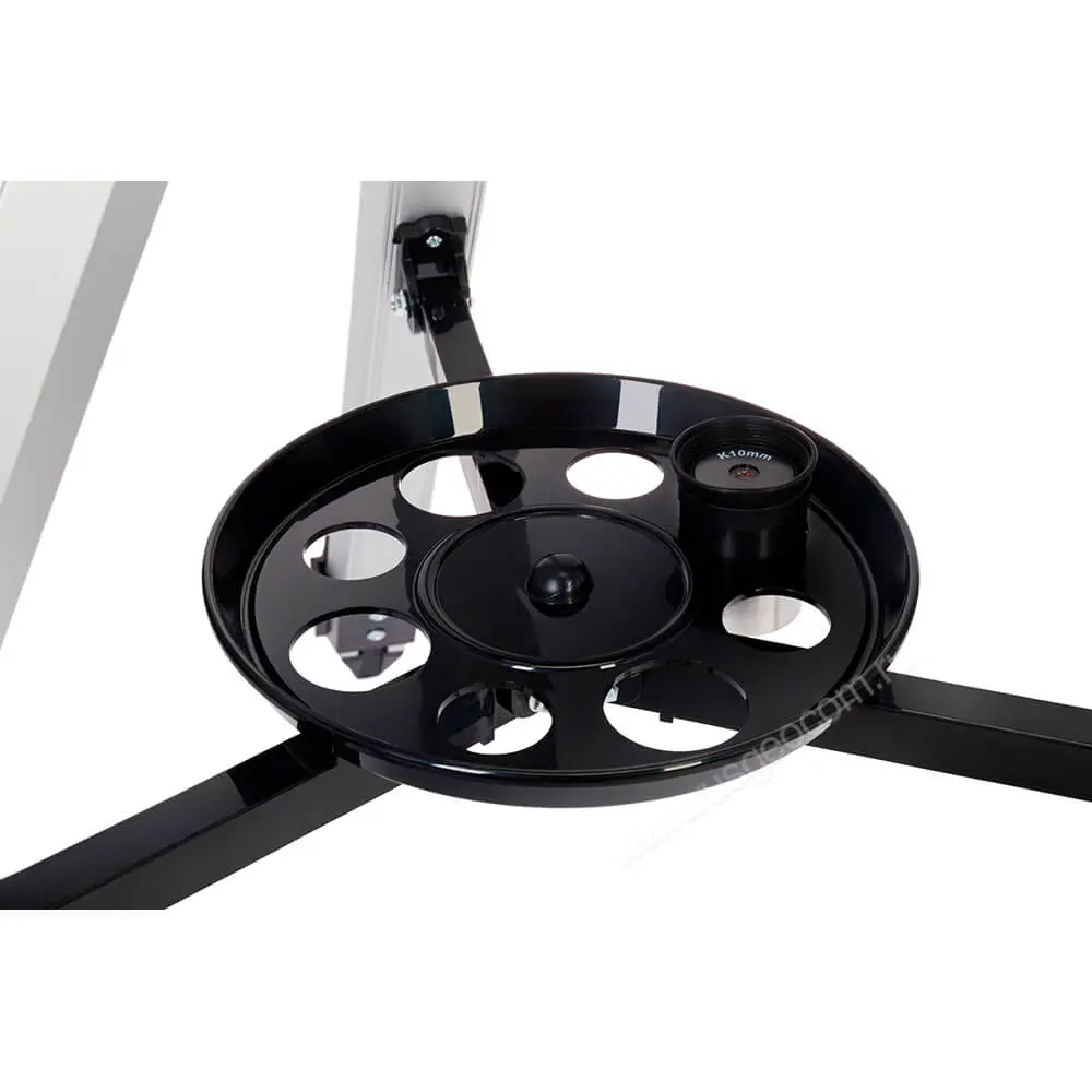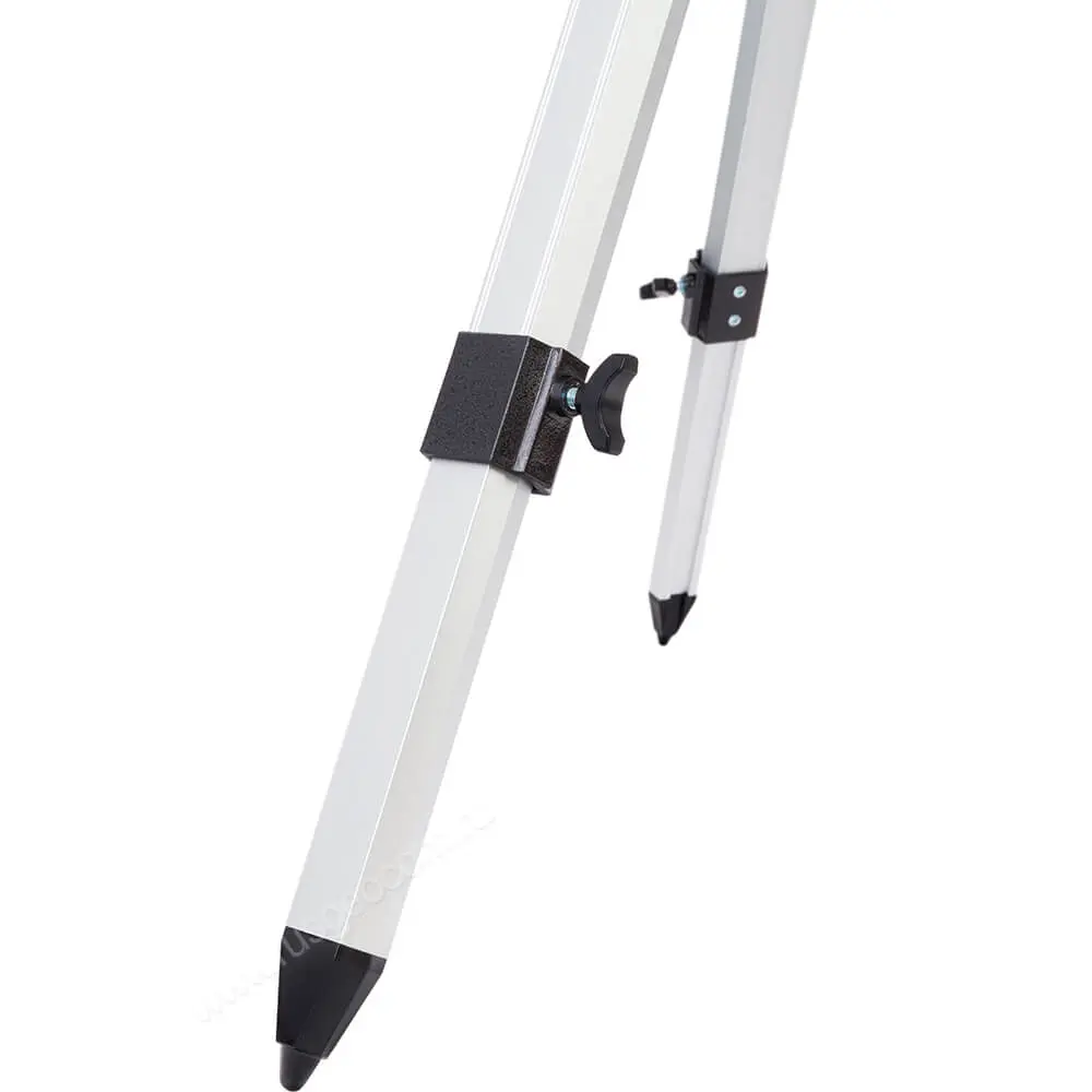 Легкий алюминиевый штатив можно подстроить под рост пользователя, зрительная труба на нем размещается устойчиво и надежно. Высоту каждой ножки можно настроить отдельно, что особенно актуально на неровной поверхности, а специальный механизм препятствует расхождению стоек в стороны. Предусмотрен удобный столик для аксессуаров, полезный при выездных наблюдениях.
