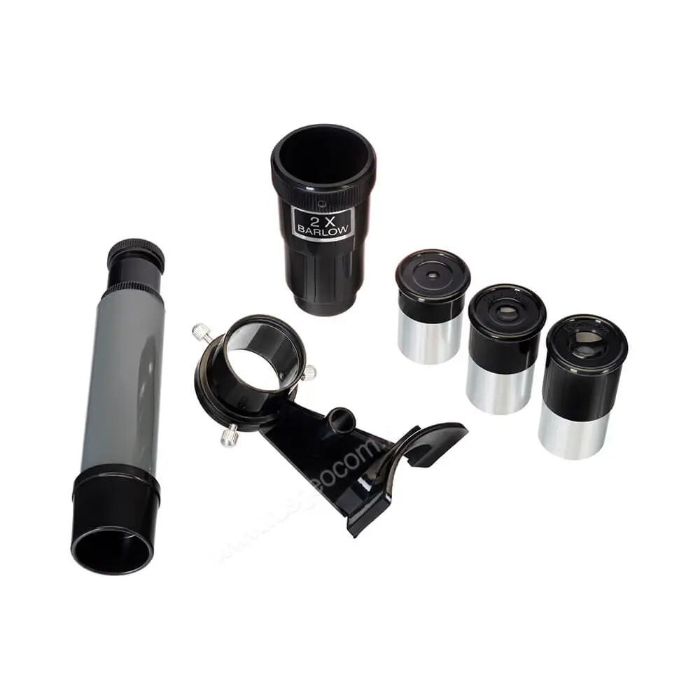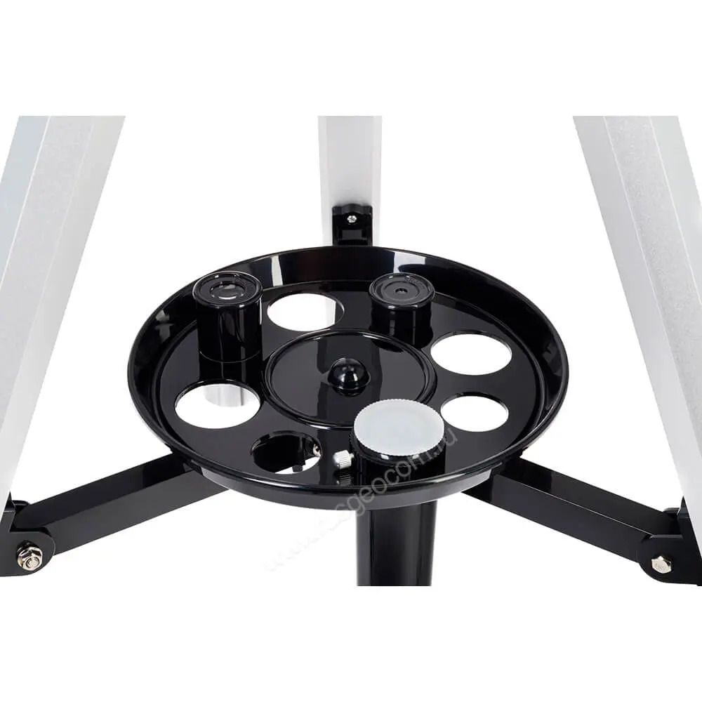 В комплект рефрактора включены все необходимые аксессуары, в том числе диагональная призма, необходимая для комфортного изучения наземных объектов. Во время работы все элементы комплекта можно разместить на специальном лотке, который монтируется на штатив. Ножки треноги регулируются по высоте независимо, что позволяет выставить оборудование оптимальным образом на неровной поверхности.