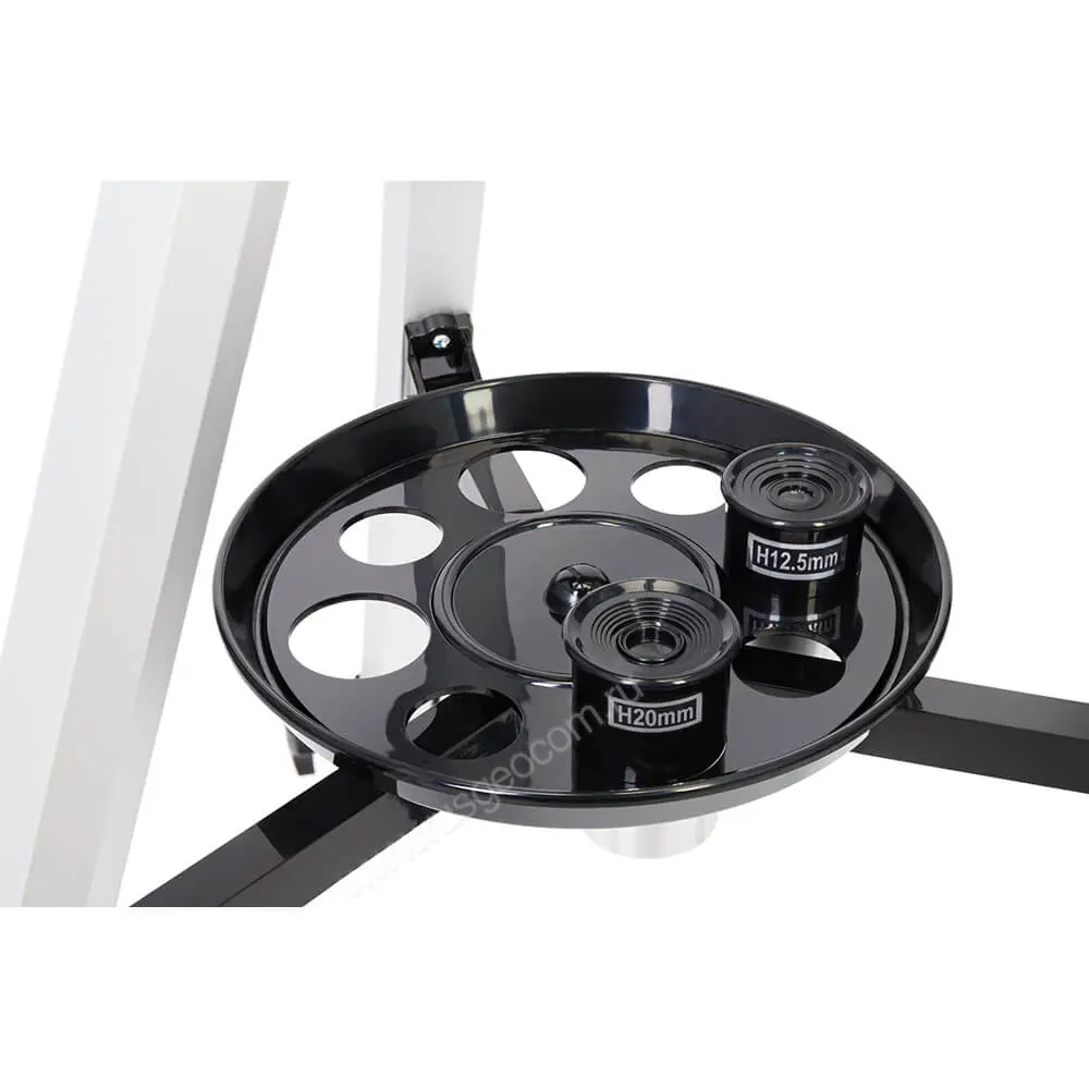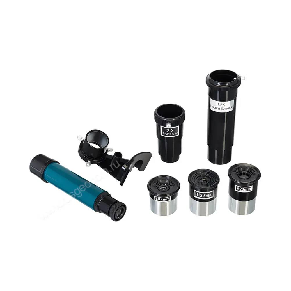 Для работы с прибором не придется ничего докупать, все необходимые аксессуары уже включены в комплект. Так, например, разные окуляры и линза Барлоу позволяют быстро менять увеличение, а искатель с пятикратным увеличением помогает выполнять предварительное наведение на небесные тела.