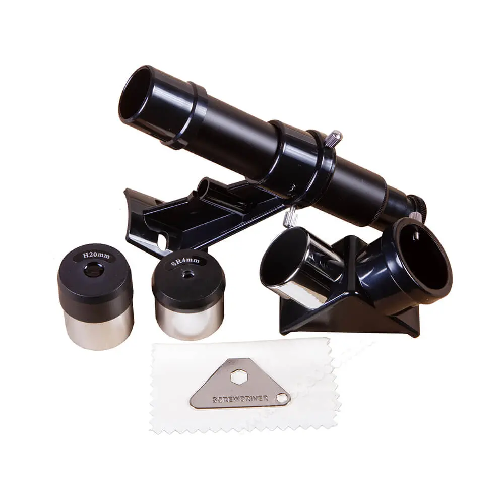 В комплект рефрактора включены все необходимые аксессуары, в том числе диагональная призма, необходимая для комфортного изучения наземных объектов. Во время работы все элементы комплекта можно разместить на специальном лотке, который монтируется на штатив. Ножки алюминиевой треноги регулируются по высоте независимо, что позволяет выставить оборудование оптимальным образом на неровной поверхности.