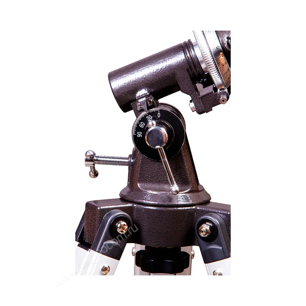 - Экваториальная монтировка и ручки тонкой подстройки положения зрительной трубы. При такой конструкции следить за небесными объектами удобнее, чем при работе с азимутальной монтировкой.