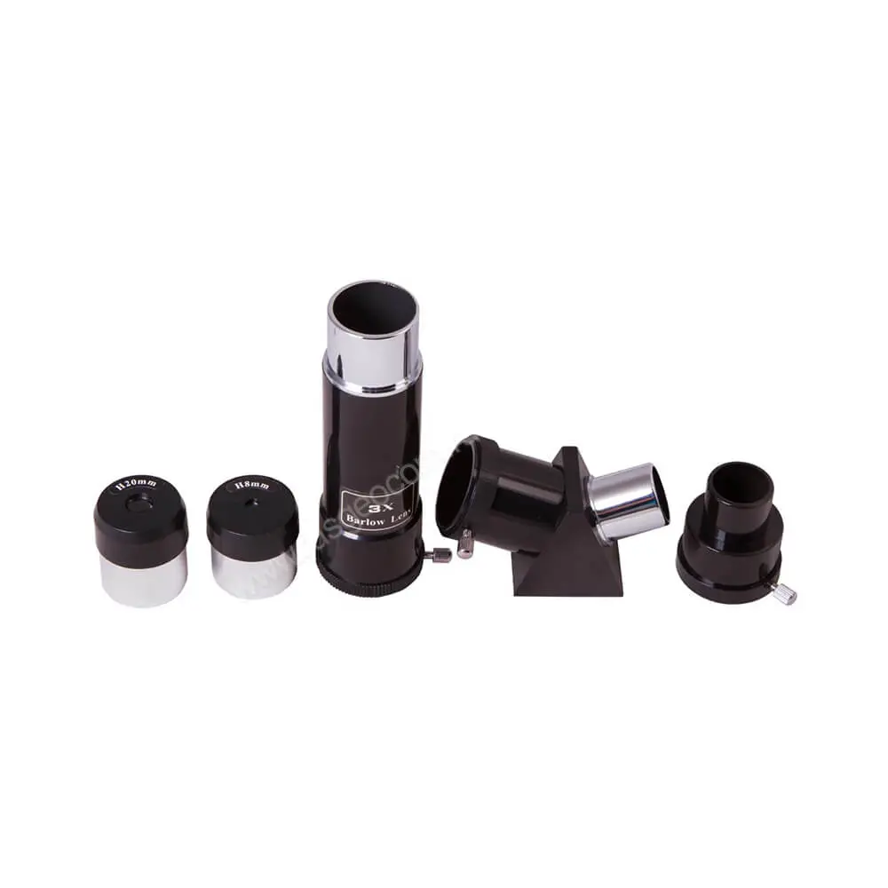 В комплект рефрактора включены все необходимые аксессуары, в том числе диагональная призма, необходимая для комфортного изучения наземных объектов. Во время работы все элементы комплекта можно разместить на специальном лотке, который монтируется на штатив. Ножки треноги регулируются по высоте независимо, что позволяет выставить оборудование оптимальным образом на неровной поверхности.