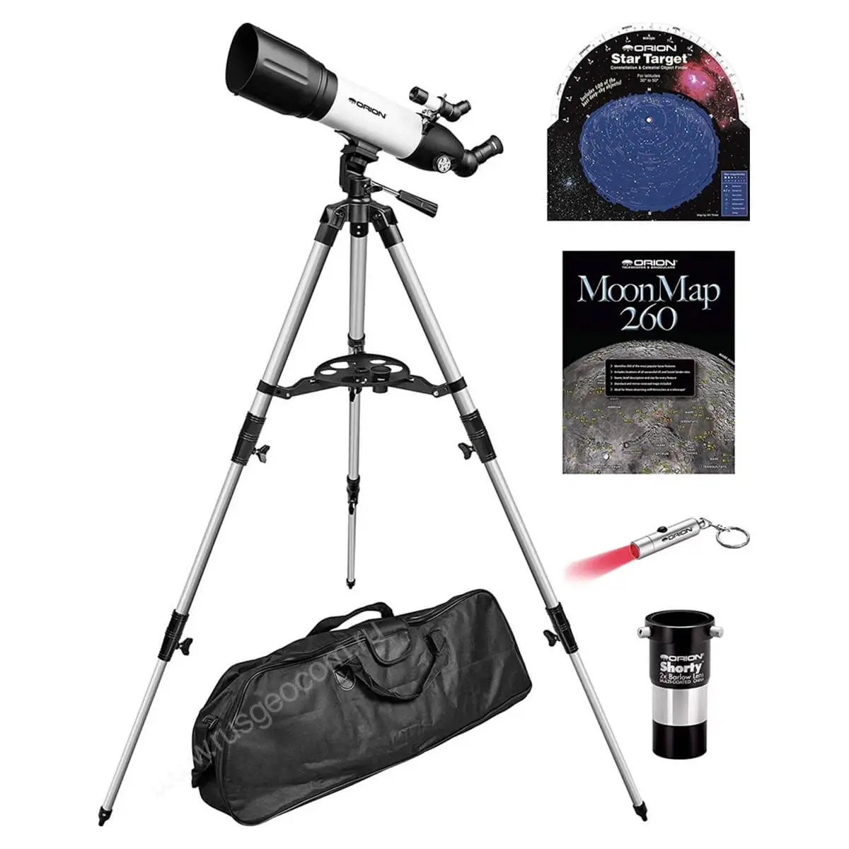 - Также в комплекте фокусер 1,25", искатель 5х20, встроенная диагональ 45°, карта объектов лунной поверхности Orion MoonMap 260.