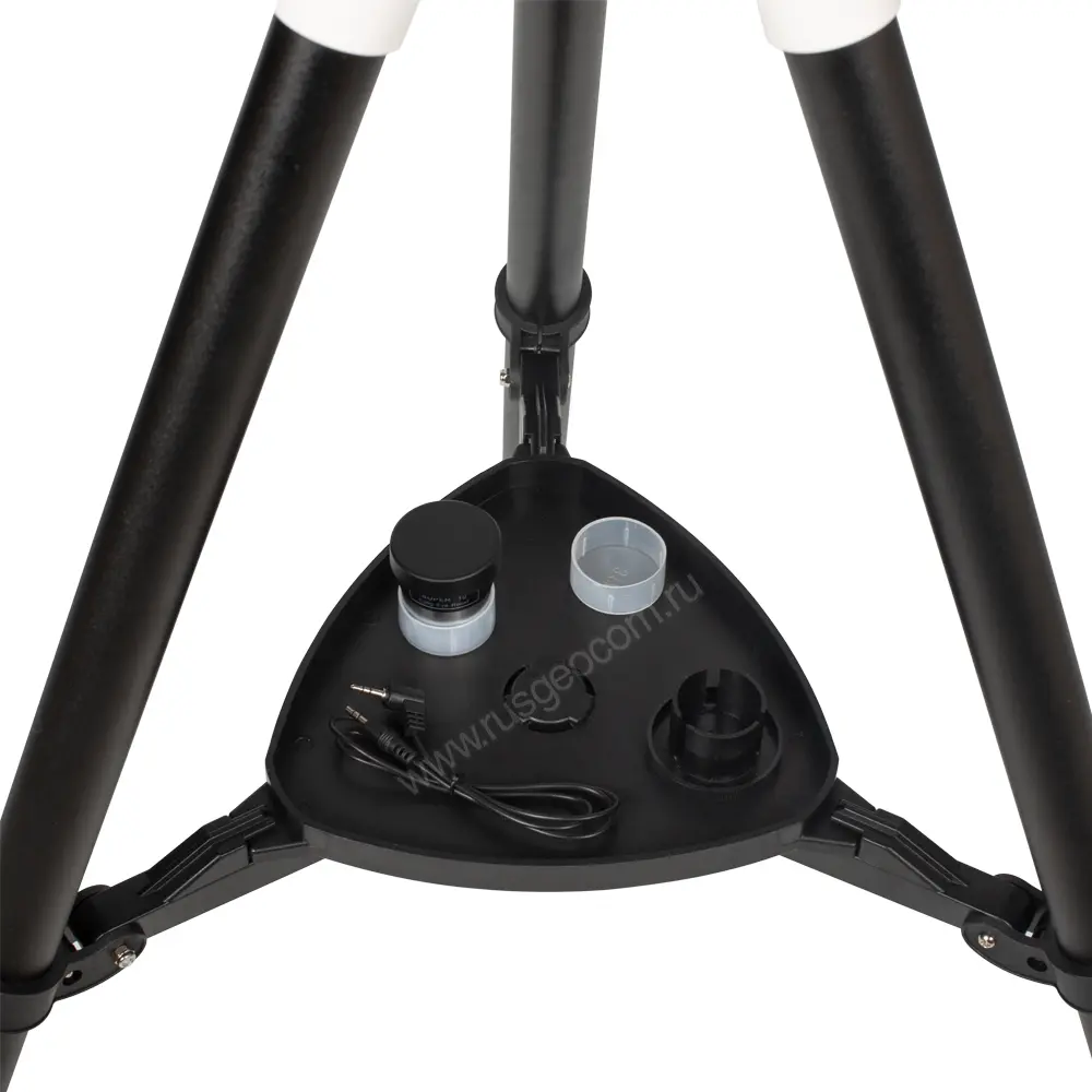 - Подставка-удлинитель между опорной площадкой треноги и монтировкой дает возможность увеличить высоту штатива, а также комфортно вести наблюдения в зенитной области, не задевая окулярным узлом ножки трипода.
