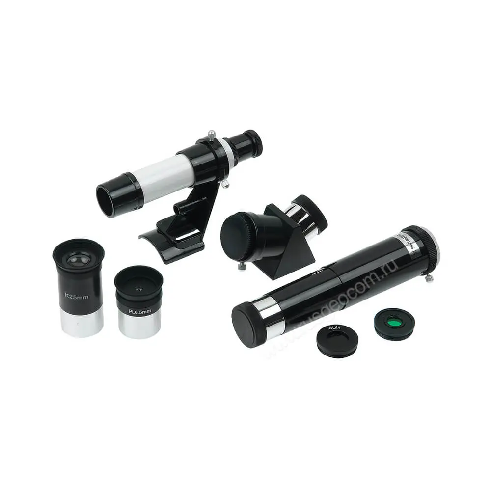 Принадлежности для работы с телескопом не нужно подбирать, всё необходимое есть в комплекте. В первую очередь это окуляры Pl6,5 и К25 с мягкими наглазниками, защищающими от боковой засветки. Если наблюдатель носит очки, то для более комфортной работы он может загнуть наглазник, чтобы уменьшить расстояние между окуляром и зрачком. Обязательно пригодятся и линза Барлоу 3х, повышающая кратность окуляров в 3 раза, и фильтры – солнечный, снижающий интенсивность света до безопасных значений, и лунный, увеличивающий контраст.