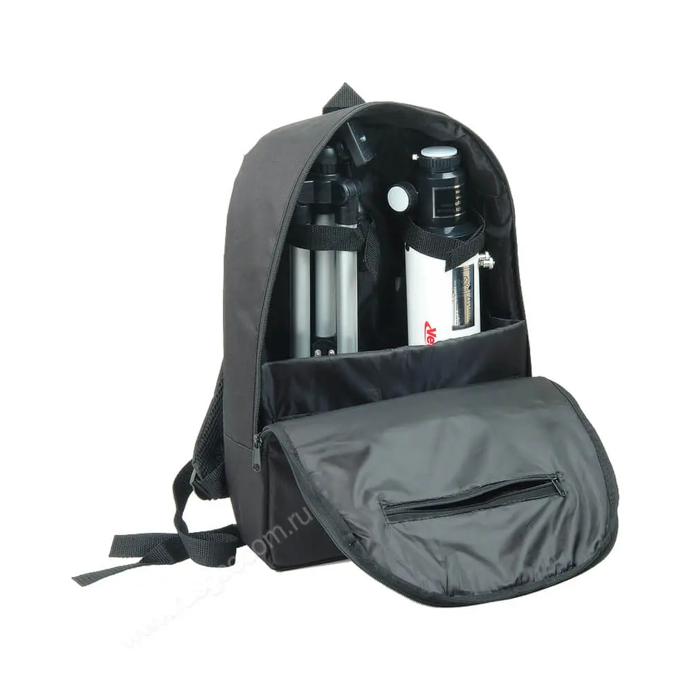 Весь комплект находится в рюкзаке. Бережное размещение трубы, треноги и комплекта принадлежностей обеспечивают мягкие амортизирующие стенки, карманы и фиксирующие стяжки.