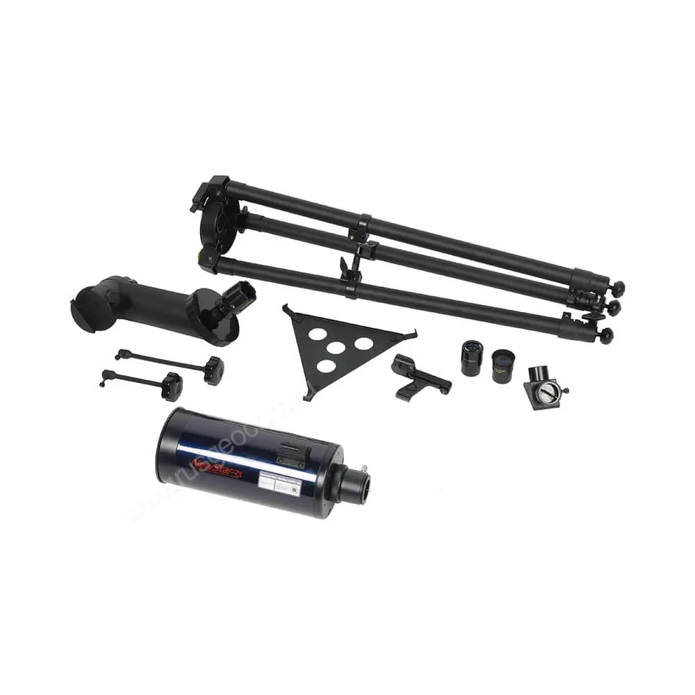 Veber NewStar MAK90 AZII - это зеркально-линзовый телескоп системы Максутова-Кассегрена в металлическом корпусе с апертурой 90 мм, фокусным расстоянием 1200 мм, окулярами PL10 и К25 и угловой призмой 90°. Искатель Red Dot с лазерной подсветкой. Труба телескопа при помощи крепежной площадки присоединяется к азимутальной монтировке, установленной на штатив-треногу.