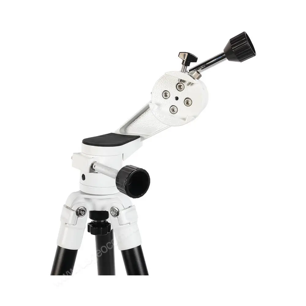 Высота металлического штатива-треноги регулируется за счет телескопической конструкции с металлическими же фиксаторами. Угол установки ног штатива изменяется при помощи металлических зажимов-стопоров. Для установки штатива на минимальную высоту, стопоры поднимаются в месте крепления к опорной площадке монтировки. Резиновые опоры на ногах оберегают поверхность пола от царапин в домашних условиях и предотвращают коррозию штатива в "полях".
