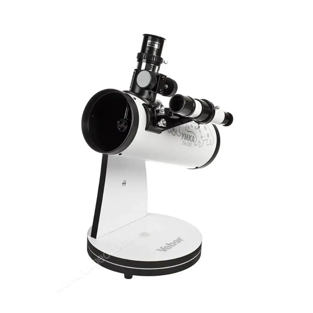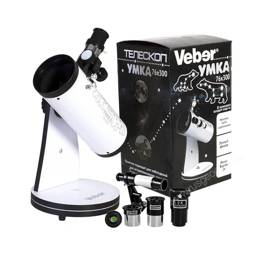 Телескоп Veber УМКА 76/300 это классический рефлектор Ньютона на азимутальной монтировке "турельного" типа (Монтировка Добсона). При таких небольших размерах (длина трубы 300 мм, 76 мм диаметр) может показаться, что это детский телескоп, но посмотрите в него- и ваше мнение изменится кардинально. Качественное изготовление и надежная конструкция телескопа позволят без труда и в деталях рассмотреть любые звезды и объекты солнечной системы. Тем более, что с увеличением 15 крат (окуляр Н20 мм) вы сможете сфокусироваться и днем на любые объекты. Этот телескоп можно использовать и как настольную зрительную трубу.