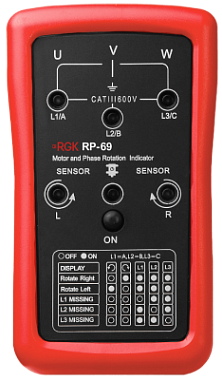 Тестирование электродвигателей производится в беспроводном режиме - достаточно просто поместить прибор на корпус установки, параллельно валу, и посмотреть на сигналы индикаторов. Индикатор чередования фаз RGK RP-69 совместим как с трехфазными, так и с однофазными двигателями за исключением моделей с частотно-регулируемым управлением.