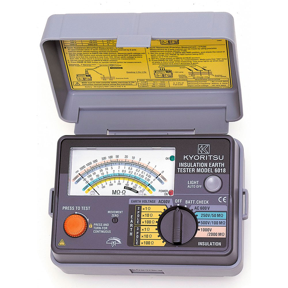 Многофункциональный измеритель Kyoritsu KEW Model 6018 - универсальный тестер, предназначенный для измерения сопротивления изоляции и сопротивления заземления при подаче напряжения малой величины, а также измерения переменного напряжения до 600 В и напряжения заземления.